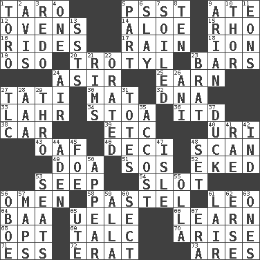 ACROSS 1. Pacific island yam 5. Inconspicuous attention getter 9. Had dinner 12. Baking chambers 14. Medicinal plant 15. 17th letter of the Greek alphabet 16. Amusement-park features 17. Water falling in drops from the sky 18. Electrically charged atom 19. Bear (Spanish) 20. Trinitrotoluene 23. Long, evenly shaped pieces 24. SW Saudi Arabia district 25. Merit 27. Jacques of French films 30. Floor covering 32. Heredity factor (abbr.) 33. Cowardly lion portrayer 34. Portico 36. It would 38. 4-wheeled motor vehicle 39. And so on (abbr.) 40. RI univ. 43. Clumsy lout 46. Tenth: prefix 48. Examine hastily 49. ___ good deed 51. Mayday 52. Made supply last 53. Ooze 54. Position in a hierarchy or organization 56. Sign of things to come 58. Soft color 61. Lion 64. Sound made by sheep 65. Ubangi River tributary 66. Acquire or gain knowledge or skills 68. Choose 69. Baby powder 70. Get up 71. Curvy letter 72. Part of Q.E.F. 73. Ancient Greek god of war DOWN 1. "Corrida" creature 2. Deliberation 3. Do over again 4. Single 5. Role in a play 6. Kill 7. Dirtied 8. Nine, plus one 9. Believer in; advocate of (suffix) 10. Son of Odin 11. Immeasurably long periods of time 13. Fast planes 21. Basketball hoops 22. Spoke pompously 23. Naughty child 24. Atmosphere 26. Black tropical American cuckoo 27. Affectionate concern, for short 28. American Automobile Association (abbr.) 29. Through, poetically 31. Lugs 35. Buttonhole 37. Evade 41. Actress Charlotte 42. Working for oneself (abbr.) 44. Arabian gulf 45. Enemy 47. Small island 48. Arrange properly for use 50. Seem 53. Theater features 55. Water jar 56. Mitch Miller's instrument 57. Atlas contents 59. Silent film actress Nazimova 60. Religious group 61. Den 62. Celtic language 63. Washington bills 65. Shoshoni 67. Period