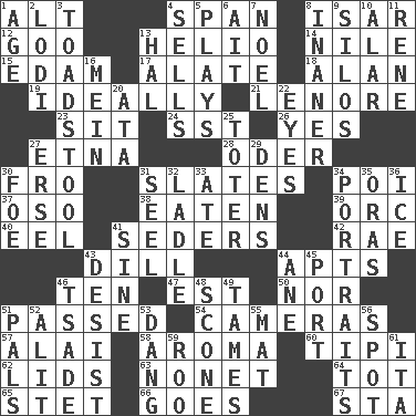ACROSS 1. Keyboard modifier key 4. Connect, as a bridge 8. Austrian river, tributary to the Danube 12. Thick or sticky substance 13. Sun: prefix 14. The longest river in the world 15. Dutch treat 17. Having winglike extensions 18. ____ Jay Lerner 19. Under perfect conditions 21. Poe poem 23. Be seated 24. Fast jet (abbr.) 26. Affirmative reply 27. Inactive volcano in Sicily 28. River in Europe 30. Back 31. Chalkboards 34. Luau course 37. Bear (Spanish) 38. Eroded 39. The grampus (Milton) 40. Snakelike fish 41. Spring feasts 42. Actress Charlotte 43. Deli pickle 44. Tenement units (abbr.) 46. Nine, plus one 47. Eastern Standard Time (abbr.) 50. Not either 51. Went by 54. Devices for capturing images 57. Mountain range southwest of Kyrgyzstan 58. Scent 60. Native american tent (variation) 62. Flaplike coverings 63. Music written for nine 64. Small child 65. Proofreading order 66. Moves 67. R.R. building DOWN 1. Mature 2. Farming town in central California 3. Inedible or poisonous agaric 4. Exchanges for money 5. Romps 6. Small island 7. Christmas carol 8. More empty; more void 9. Grain storage towers 10. Having or resembling wings 11. French philosopher Descartes 13. Actor Linden 16. Chow _ 20. "One Day ___ Time" 22. Sight organs 25. Carrier 27. Celtic language 29. Hiding places for outlaws 30. Enemy 31. Sew up the eyelids of hawks and falcons 32. Dipping utensil 33. Had dinner 34. Likenesses of persons 35. Mouths or openings 36. Frozen water 41. Trig term 43. Cease 44. One (Scot) 45. Left side of a ship or aircraft 46. Sadhe (variant) 48. Biscuitlike quick bread 49. Corrects by punishment or discipline 51. Friends 52. Came down and settled, as after flight 53. Mild oath, euphamism for damn 55. Floor protector 56. Blemish 59. Friend of Pooh 61. Call ___ day