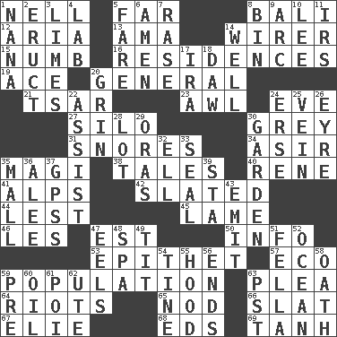 ACROSS 1. 1994 drama film starring Jodie Foster 5. Distant 8. Indonesian resort city 12. Roberta Peters solo 13. Nanny (var.) 14. One who wires 15. Unfeeling 16. Dwellings 19. Adept person 20. Commissioned military rank 21. Russian ruler of old 23. Leather borer 24. Night before a holiday 27. Grain storage tower 30. Jennifer or Joel 31. Sounds asleep 34. SW Saudi Arabia district 35. Wise men 38. Falsehoods 40. French philosopher Descartes 41. High mountains 42. Scheduled 44. For fear that 45. Unable to walk 46. French article 47. Eastern Standard Time (abbr.) 50. Information 53. Curse 57. Environmental prefix 59. Census information 63. Entreaty 64. Debaucheries 65. Dreamland 66. Narrow board 67. Writer Wiesel 68. Begley and Asner 69. Hyperbolic tangent DOWN 1. Nanny 2. Spew [out] 3. Citrus fruits 4. Experiment locale 5. Conductor's collection 6. So be it 7. To erase 8. Storage container 9. Curve 10. Area sheltered from the wind 11. Big collection agency 14. Water source 17. Retirement account (abbr.) 18. Simpleton 20. Smile widely 22. Aid 24. Celtic language 25. Distinctive style or manner 26. Jane of fiction 28. Car dealer's back yard 29. Mouths or openings 30. Place where plants grow 32. Pipe bend 33. Lick closed 35. Promenade 36. Toward shelter 37. Global Positioning Systems (abbr.) 39. R.R. building 43. Give off 47. Snakelike fish 48. Health resort 49. Teat (slang) 51. Man or boy (slang) 52. Sea 54. Prong on a fork 55. Parka part 56. Extremities 58. Pledge 59. Before (prefix) 60. Lubricate 61. Luau course 62. Shoshoni 63. Pacific Standard Time (abbr.)