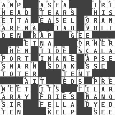 ACROSS 1. Electrical Unit 4. At sea 8. Three (prefix) 11. Froth on beer 13. Lacerates 15. Part of HMS, perhaps 16. Singer James 17. Artist's stand 18. Northwest Algerian city 19. Sports stadium 21. The 19th letter of the Greek alphabet 22. Electrical Unit 23. Lair 24. Reproach for some lapse or misdeed 27. Unit of force equal to gravity 29. Inactive volcano in Sicily 30. Abalone 34. Layer 36. Periodic rise and fall of the sea level 39. Any of the three canals of the cochlea 40. Left side of a ship or aircraft 41. Silly 43. Domed church section 44. Excessive but superficial compliments 46. Neighbor of Neb. 47. Compass dir. 48. Carrier 49. Portable shelter 51. Small island 53. Begley and Asner 54. Before (prefix) 57. Confront 60. It is 63. Of or pertaining to a thread or threads 65. Like ___ of sunshine 66. Strips of potato fried in deep fat 69. Billionth: prefix 70. Title for a knight 71. Man or boy (slang) 72. Colored 73. "___ Little Indians" 74. Seaweed 75. Perceive with the eye DOWN 1. At or in the front 2. Distance measurement (Brit.) 3. Eucharist need 4. Had dinner 5. Ocean 6. Compass direction 7. Length times width 8. Through, poetically 9. Monetary unit of Yemen 10. Is not 12. Daniel's nick name 14. Strike heavily 18. Cloudy 20. Tate display 25. Against 26. Aches 28. Greek goddess of the dawn 29. Plea 31. Atlas contents 32. Otherwise 33. Actress Charlotte 34. Like (prefix) 35. Part of Q.E.F. 37. June honoree 38. Related on the mother's side 40. Pacific Standard Time (abbr.) 42. Supplemented with great effort 45. Medical imaging device (abbr.) 50. Overdraft (abbr.) 52. Small quarrel 54. Romps 55. The wife of a rajah (variant) 56. Eat (away) 57. Vertical spar for supporting sails 58. One of the Great Lakes 59. Merit 61. Long journey 62. Filth; sediment 64. Working for oneself (abbr.) 67. Pipe bend 68. Plant excrement