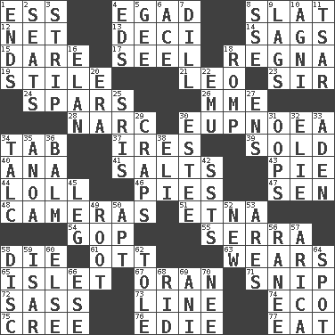 ACROSS 1. Double-curved letter 4. Mild oath 8. Narrow board 12. Fish or hair follower 13. Tenth: prefix 14. Droops 15. Have the gumption 17. Sew up the eyelids of hawks and falcons 18. Canadian anthropologist Darnell 19. Vertical member of a panel or frame 21. Lion 23. Title for a knight 24. Practice fights 26. Madame (abbr.) 28. Drug cop 30. Normal relaxed breathing 34. Keyboard key 37. Angers 39. Disposed of to a purchaser 40. Santa ___, CA 41. Table seasonings 43. Sliced dessert 44. Hang loosely or laxly 46. Sliced desserts 47. Elected rep. 48. Devices for capturing images 51. Inactive volcano in Sicily 54. Republican Party 55. Father Junipero _ 58. Pass on 61. Baseball player Mel 63. Puts on (as clothing) 65. Small island 67. NW Algerian seaport 71. Sever or remove by pinching or nipping 72. Backtalk 73. Actor's bit 74. Environmental prefix 75. Algonquian 76. Singer Brickell 77. Ingest DOWN 1. Conclusions 2. Theater features 3. Remove all contents or possession from 4. Begley and Asner 5. Turn to the right 6. Adept person 7. Deli pickle 8. Compass dir. 9. Falls behind 10. Hindu god of fire 11. Russian ruler of old 16. Enthusiasm 18. Frolic 20. Epoch 22. Australian flightless bird 25. Indian titles of respect 27. Followers of ems 29. Dice game 30. First name in cosmetics 31. I made a mistake 32. Writer Wiesel 33. Arabian gulf 34. Baby powder 35. Small Philippine buffalo 36. Lip ointment 38. Connecticut Ivy Leaguer 42. Fast planes 45. Part of a journey 49. Carrot, for example 50. Fitting 52. ___ Haven, CT 53. Ancient Greek god of war 56. The wife of a rajah (variant) 57. N. Chile seaport 58. Compact _ 59. Austrian river, tributary to the Danube 60. Otherwise 62. Lacquered or enameled metalware 64. Specific locale 66. Compass dir. 68. To free from 69. Cuckoo 70. Born