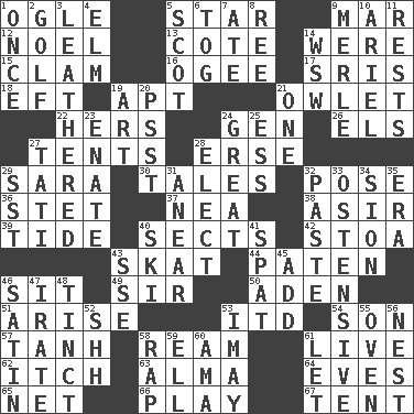 ACROSS 1. Stare 5. Play the lead 9. Impair 12. Christmas carol 13. ____ d'Azur (French Riviera) 14. We are 15. Burrowing marine mollusk 16. Double curve, resembling the letter S 17. Indian titles of respect 18. Newt 19. Fitting 21. A small or young owl 22. Possessive pronoun 24. Commissioned military rank (abbr.) 26. Raised railways 27. Portable shelters 28. Celtic language 29. "Two Mules for Sister ____" 30. Falsehoods 32. Airs 36. Proofreading order 37. Teachers' org. 38. SW Saudi Arabia district 39. Event that recurs at intervals 40. Religious groups 42. Portico 43. Three-handed card game 44. Eucharist need 46. Be seated 49. Title for a knight 50. An important port of Yemen 51. Get up 53. It would 54. Manchild 57. Hyperbolic tangent 58. 480, 500 or 516 sheets of paper 61. Not recorded 62. Hankering 63. _ mater 64. Nights before holidays 65. Fish or hair follower 66. Shaw product 67. Portable shelter DOWN 1. Single time 2. _ course 3. Tough but pliablecoriaceous 4. Shade tree 5. Highlander 6. Coat; cloak 7. Had dinner 8. Portuguese money of account (variant) 9. Haggard of country music 10. Satellite of Uranus 11. Musical pauses 14. Compass dir. 19. Nonscientific branch of learning 20. Inconspicuous attention getter 21. Single 23. Maternal 24. Relatively large 25. Curvy letter 27. Jacques of French films 28. Opt 29. Fast jet (abbr.) 31. Approach 32. Thick mixture 33. Clearly or manifestly demonstrative 34. The Jewish people; Israel 35. Epoch 40. What Jean-Claude Killy likes to do 41. Petty quarrel 43. Compass dir. 45. Increase 46. Smooth fabric 47. Feeling or showing extreme anger 48. A color or tint 52. Quiet! 53. "If ____ say so..." 55. Baking chamber 56. A home for chicks 58. Hit sharply and swiftly 59. Pipe bend 60. Nanny (var.) 61. Allow
