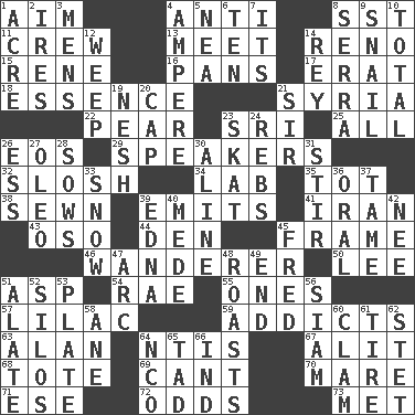 ACROSS 1. Direct toward a target or goal 4. Opposed to 8. Fast jet (abbr.) 11. Ship's personnel 13. Confront 14. Former U.S. Attorney General Janet 15. French philosopher Descartes 16. Zero-star reviews 17. Part of Q.E.F. 18. Gist 21. Damascus' land 22. Lightbulb-shaped fruit 23. _ Lanka 25. Everything 26. Greek goddess of the dawn 29. Orators 32. Agitate, as a liquid 34. Experiment locale 35. Small child 38. Stitched 39. Gives off 41. SW Asia republic 43. Bear (Spanish) 44. Lair 45. Movie unit 46. Roamer 50. Area sheltered from the wind 51. Cleo's killer 54. Actress Charlotte 55. Singles 57. Pale purple color 59. Inveterate users 63. ____ Jay Lerner 64. Nuclear Threat Initiatives 67. Set down 68. Lug 69. Patter 70. Female horse 71. Compass dir. 72. Probability 73. Was introduced to DOWN 1. Land measure 2. Angers 3. Not women's 4. Electrical Unit 5. Teachers' org. 6. Nine, plus one 7. ___ a Wonderful Life 8. Spanish missionary in California 9. Slow-paced one 10. "_____ Recall" 12. Shed a tear 14. Marina Del _, California 19. Tender 20. Head covering 21. Title for a knight 23. Three-handed card game 24. Confederate soldiers (slang) 26. Curvy letter 27. Butter sub 28. Sty mamas 30. Place in a line 31. Use a spoon 33. Overwhelm 36. Of the mouth 37. Not wild 39. Pulitzer Prize-winning author Ferber 40. Ancient Persian 42. Born 45. Flintstone 47. Curve 48. Exposes to great heat 49. Conclusion 51. Having winglike extensions 52. Grain storage towers 53. Food holder 56. Thailand, formerly 58. A saturated hydrocarbon 60. Burrowing marine mollusk 61. Hoop that covers a wheel 62. Proofreading order 64. Non-commissioned officer (abbr.) 65. Small boy 66. Working for oneself (abbr.)