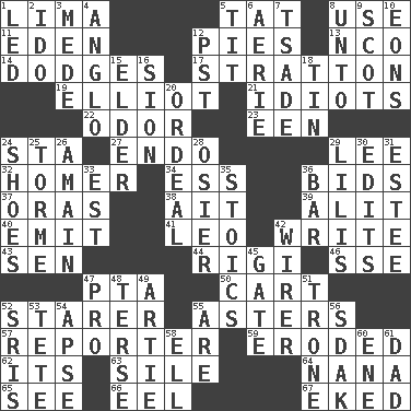 ACROSS 1. Pale green bean 5. Make lace 8. Purpose 11. Paradise 12. Sliced desserts 13. Non-commissioned officer (abbr.) 14. Evades 17. Ski resort town in Vermont 19. American author Paul (1891-1958) 21. Foolish or stupid persons 22. Scent 23. Car or cant ending 24. R.R. building 27. Inside; within (prefix) 29. Area sheltered from the wind 32. Home run 34. Double-curved letter 36. Auction offers 37. Mouths or openings 38. Small island 39. Came down and settled, as after flight 40. Give off 41. Lion 42. Compose 43. Elected rep. 44. Swiss mountan, "Queen of the Mountains" 46. Compass dir. 47. Parent Teacher Assoc. 50. Haul 52. A viewer who gazes fixedly 55. Michaelmas daisies 57. News announcer 59. Worn away 62. It is 63. Drop; flow; fall 64. Grandmother 65. Observe 66. Snakelike fish 67. Made supply last DOWN 1. Directed 2. Wedding promise 3. Ancient Persian 4. White American of non-Hispanic descent 5. Teat (slang) 6. Nest on high 7. Sadhe (variant) 8. To (old English) 9. Native of Scotland 10. Immeasurably long periods of time 12. Pacific Standard Time (abbr.) 15. A person who is older than you are 16. The Jewish people; Israel 18. Metal container 20. Severe or trying experience 24. Imelda's hoard 25. Singer Mel 26. At full speed 28. Flexible twig of a willow tree 29. Ms. Damita and namesakes 30. Prepares for publication 31. First name in cosmetics 33. Eastern Standard Time (abbr.) 35. Unemotional ones 36. Soap unit 42. One who wires 45. Yard entry 47. Adept person 48. Laconic 49. Nick name for Arthur 51. Heavy duty weighing machine 52. Indian titles of respect 53. Wig 54. Domed church section 55. "We ___ not amused" (Victoria) 56. Neighbor of Neb. 58. Pipe bend 60. Compass dir. 61. June honoree