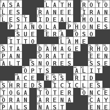 ACROSS 1. White ___ sheet 4. Thin strip of wood or metal 8. Printing process, for short 12. French article 13. The wife of a rajah (variant) 14. SW Asia republic 15. For fear that 17. Standard of perfection 18. Undercover agent 19. Player piano 21. Gives a jingle 23. Institute legal proceedings 24. Period 26. Bear (Spanish) 27. "Tell ____ the Marines!" 28. Unable to walk 30. R.R. building 31. Break 34. 17th letter of the Greek alphabet 37. Baking dish 38. Speak pompously 39. Car or cant ending 40. Keyboard modifier key 41. Sounds asleep 42. Compass dir. 43. Chooses 44. Set down 46. Adept person 47. Curvy letter 50. To free from 51. Fragments 54. Winter's stalactites 57. Ancient Roman robe 58. Carrier 60. Single time 62. NW Algerian seaport 63. Sports stadium 64. Island 65. Friends 66. Political cartoonist Thomas 67. Compass dir. DOWN 1. Everything 2. Ooze 3. Helper 4. Dipping utensil 5. Approach 6. Afternoon social gathering 7. Aid 8. Full of chinks, cracks, or crevices 9. U. of Maine site 10. Lie 11. Singles 13. _ de Janeiro 16. Strained 20. Modern: prefix 22. Residence 25. Having winglike extensions 27. Slanted text style (abbr.) 29. Eons 30. Health resort 31. Do not 32. Came up 33. Third mo. 34. Home 35. Command 36. Single 41. Broke a traffic law 43. Seas 44. Curve 45. _ and Stitch 46. Therefore, facetiously 48. Locates 49. Odor 51. Cease 52. Israeli folk dance 53. Comedian Laurel of Laurel & Hardy 55. Lyricist Gershwin 56. Glance over 59. Mouth or opening 61. Sight organ
