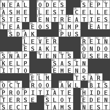 ACROSS 1. Actress Patricia 5. Lyric poems 9. Back-to-school mo. 13. American tennis player Robert 14. For fear that 15. Cell (Danish) 16. Proofreading order 17. Pleas 19. Beverage made from leaves 20. Greek goddess of the dawn 21. Mischievous child 22. Consume 23. Neighbor of Neb. 25. Suppuration 26. Prying instrument 30. It's straight from the horse's mouth 34. 1973 Nobel Price Winner (Physics) Leo 35. Southwest Nigerian state 36. Fastener 39. Portable shelters 42. One who makes use of a thing 43. Seaweed 44. Indian antelope 46. "Tell ____ the Marines!" 47. Make improvements or corrections to 48. Shade tree 51. Russian ruler of old 54. Sep. follower 57. Friend of Pooh 58. Leather borer 60. Altar cloth linen 62. Conciliate 65. Flintstone garb 66. Laconic 67. Narrow, elongated depression 68. Genesis locale 69. Religious group 70. Scottish caps 71. A home for chicks DOWN 1. Political cartoonist Thomas 2. _____ Park, CO 3. At or in the front 4. Allow 5. Margarine 6. Cub Scout units 7. Eastern Standard Time (abbr.) 8. Long narrow piece of something 9. Put into a specified state 10. Writer Wiesel 11. Entreaty 12. Trial 15. Smile enhancers 18. Australian flightless bird 20. Supplements with great effort 24. City in Syria 27. Large container 28. Make supply last 29. Remove soap 30. Periods in a boxing match 31. Followers of ems 32. Binary compound 33. Not either 36. What Jean-Claude Killy likes to do 37. Fish or hair follower 38. Keyboard modifier key 40. Scottish cap 41. Compass dir. 45. International (abbr.) 48. 4th largest of the Great Lakes 49. Car dealer's back yard 50. Wet 52. Stay 53. Amusement-park features 54. Chooses 55. Algonquian 56. Torque (variant) 58. Tiny particle 59. Moistens 61. Transmitted 63. Pacific Standard Time (abbr.) 64. According to 65. Layer
