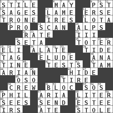 ACROSS 1. Vertical member of a panel or frame 6. Fifth month 9. Pacific Standard Time (abbr.) 12. Gurus 13. Unable to walk 14. Celtic language 15. Marketplace scale 16. Angers 17. Globular water bottle used in Asia 18. Adept person 19. Examine minutely or intensely 20. High mountains 21. Pace 23. One more than two 24. Stalk of a moss capsule 25. Carrier 28. Connecticut Ivy Leaguer 30. Having winglike extensions 34. Periodic rise and fall of the sea level 35. Label 36. Dodge 38. Santa ___, CA 39. Prong on a fork 41. Trials 43. Scottish cap 44. Believer in; advocate of (suffix) 46. Flintstone garb 48. Bear (Spanish) 49. Become fatigued 50. Ship's personnel 51. Coalition 53. Distress signal 56. Silvers or Donahue 57. Operatic vocal solo 58. 61 cubic inches 60. Perceives with the eye 61. Transmit 62. First name in cosmetics 63. Big collection agency 64. Had dinner 65. Fur scarf DOWN 1. Fast jet (abbr.) 2. Canvas cover 3. Composer Stravinsky 4. Poe poem 5. Compass dir. 6. Hindu Mythology: god of death 7. So be it 8. It is so 9. Appease 10. Fast planes 11. Afternoon social gathering 13. Louse (plural) 14. American author Paul (1891-1958) 19. Lacking originality or spontaneity 20. Small island 22. "One Day ___ Time" 24. Seigniories (variant) 26. Pulitzer Prize-winning author Ferber 27. 480, 500 or 516 sheets of paper 28. Singer James 29. Den 31. Keyboard modifier key 32. Third day of the wk. 33. Begley and Asner 37. Principle of right and wrong 40. Artist's stands 42. Title for a knight 45. Immediately 47. Cease 49. Frog relative 50. "Mermaids" star 51. Cy Young winner Saberhagen 52. Actor's bit 54. Von Bismarck 55. Stitch closed the eyes of (a falcon) 56. Air pressure measure (abbr.) 57. White ___ sheet 58. French article 59. To riddle