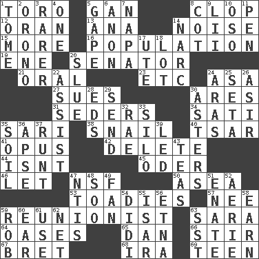 ACROSS 1. "Corrida" creature 5. Separate the seeds from cotton 8. Hoof sound 12. NW Algerian seaport 13. Santa ___, CA 14. Annoying sound 15. Greater amount 16. Census information 19. Compass dir. 20. Legislator 21. Spoken 23. And so on (abbr.) 24. White ___ sheet 27. Institutes legal proceedings 30. Ancient Greek god of war 31. Spring feasts 34. Suttee (variant) 35. Indian skirt 38. Slow-paced one 40. Russian ruler of old 41. Musical composition 42. Keyboard key 44. Is not 45. River in Europe 46. Allow 47. Science/research agcy. 50. Toward the sea 53. Sycophants 57. Born 59. One who advocates reunion 63. "Two Mules for Sister ____" 64. Fertile tracts in a desert 65. One of the 12 tribes of Israel 66. Use a swizzle stick 67. Cy Young winner Saberhagen 68. Retirement account (abbr.) 69. Adolescent DOWN 1. Heavy book 2. U. of Maine site 3. More valued for its uncommonness 4. Single 5. Open wide 6. At once, immediately (arch.) 7. California wine valley 8. Small bed 9. Cards in a Roman deck? 10. Bear (Spanish) 11. Writing instrument 14. Drug cop 17. Shoshoni 18. Car dealer's back yard 20. Turn sharply 22. Help 24. Caspian sea tributary 25. Bristle 26. SW Saudi Arabia district 28. Begley and Asner 29. Transmit 30. Michaelmas daisies 32. Actress Charlotte 33. Grain storage tower 35. Land 36. Domed church section 37. The smallest animal of a litter 39. Directed 43. Afternoon social gatherings 47. Nuclear Threat Initiatives 48. "Barney Miller" actor Jack 49. Avid follower 51. Maternal 52. Nest on high 54. "You Light Up My Life" star Conn 55. Austrian river, tributary to the Danube 56. Inactive volcano in Sicily 58. Merit 59. Director Reiner 60. Hearing organ 61. Purpose 62. Remaining after all deductions 63. Fast jet (abbr.)