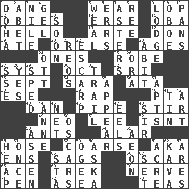 ACROSS 1. Mild oath, euphamism for damn 5. Erode 9. Chop off 12. Off-Broadway awards 14. Celtic language 15. Chief or king in Benin or Nigeria 16. Phone greeting 17. Johnson of "Laugh-In" 18. Spanish title 19. Had dinner 20. Threatening words 23. Ripens 24. Singles 25. Loose flowing garment 27. System (abbr.) 30. Sep. follower 32. _ Lanka 33. Back-to-school mo. 34. "Two Mules for Sister ____" 36. _ moment's notice (2 wds.) 38. Compass dir. 39. Hit sharply and swiftly 40. Parent Teacher Association (abbr.) 43. One of the 12 tribes of Israel 46. Corncob 48. Disorderly outburst 49. Modern: prefix 51. Area sheltered from the wind 52. Is not 53. Pismires 54. Having or resembling wings 56. Stockings 58. Unrefined 61. Alias (abbr.) 64. Followers of ems 65. Droops 66. Motion picture award 68. Adept person 69. Long journey 70. Impudent aggressiveness 71. Writing instrument 72. Toward the sea 73. Afternoon social gatherings DOWN 1. Capital of the state of Qatar 2. Collude with 3. The longest river in the world 4. Set 5. Welt 6. Blunders 7. Michaelmas daisies 8. To riddle 9. Cabin 10. Mitch Miller's instrument 11. Zero-star reviews 13. Within a short period 21. Vintage cars 22. Fortification 23. "This won't hurt ____!" 24. Baseball player Mel 26. Mouth or opening 27. Compass dir. 28. Affirmative reply 29. Hurried 31. Go after with the intent to catch 35. Become visible 37. Flats, for short 41. Metal container 42. Tate display 44. Queen of England 1702-14 45. Fish or hair follower 47. Snakelike fish 48. Title for a knight 50. Motion picture awards 53. NE Netherlands city 55. A really long time 56. Pile 57. At one time in the past 59. Double curve, resembling the letter S 60. "____ silly question..." 61. 43,560 square feet 62. Polynesian shrub of the pepper family 63. Ancient Greek god of war 65. R.R. building 67. Arrange properly for use