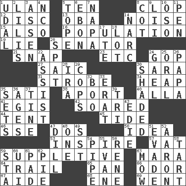 ACROSS 1. ____ Bator, Mongolia 5. Nine, plus one 8. Hoof sound 12. Compact _ 13. Chief or king in Benin or Nigeria 14. Annoying sound 15. In addition 16. Census information 19. Whopper 20. Elected representative 21. Fastener 23. And so on (abbr.) 24. Grand Old Party 27. Ketch in the Levant 30. "Two Mules for Sister ____" 31. Disco prop 34. Pile 35. Suttee (variant) 38. To the left, to Queeg 40. Silent film actress Nazimova 41. Armor plate that protects the chest 42. Flew 44. Portable shelter 45. Periodic rise and fall of the sea level 46. Compass dir. 47. Two (Sp.) 50. It may be bright or harebrained 53. Heighten or intensify 57. Large container 59. Supplementary 63. Hindu Mythology: god of death 64. Go after with the intent to catch 65. Baking dish 66. Scent 67. Assistant 68. Compass dir. 69. Gone DOWN 1. Hereditary estate 2. Ms. Damita and namesakes 3. NE Netherlands city 4. Non-commissioned officer (abbr.) 5. Drink excessively 6. Inky black, to poets 7. California wine valley 8. Small bed 9. Cards in a Roman deck? 10. Bear (Spanish) 11. Writing instrument 14. Drug cop 17. Shoshoni 18. Car dealer's back yard 20. Petty quarrel 22. Help 24. Highlander 25. Of the mouth 26. Dad 28. Lyricist Gershwin 29. 911 reaches them 30. Cast a shadow over 32. Sometimes accompanies a hiss 33. Part of Q.E.F. 35. Arranges properly for use 36. Grows older 37. Prong on a fork 39. Three (prefix) 43. Singer Brickell 47. Deli pickle 48. Single 49. Fast jet (abbr.) 51. Elude 52. Composer Copland 54. Corncob 55. "Terrible" tsar 56. French philosopher Descartes 58. Small pie 59. R.R. building 60. RI univ. 61. Writing tablet 62. Sliced dessert 63. Cut the grass