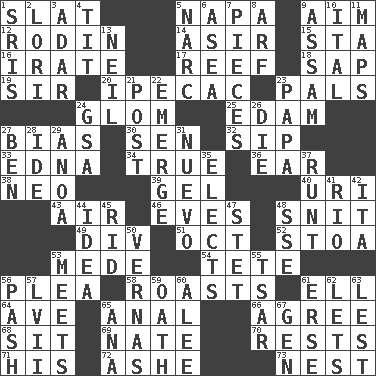 ACROSS 1. Narrow board 5. California wine valley 9. Direct toward a target or goal 12. "The Thinker" sculptor 14. SW Saudi Arabia district 15. R.R. building 16. Feeling or showing extreme anger 17. Coral collection 18. Plant excrement 19. Title for a knight 20. Medicinal drug used to evoke vomiting 23. Friends 24. Seize upon or latch onto something 25. Dutch treat 27. Prejudice 30. Elected rep. 32. Small drink 33. Pulitzer Prize-winning author Ferber 34. Loyal 36. Hearing organ 38. Modern: prefix 39. Set 40. RI univ. 43. Atmosphere 46. Nights before holidays 48. In a ____ (agitated or irritated) 49. HTML Container Element 51. Sep. follower 52. Portico 53. Ancient Persian 54. False hair 56. Entreaty 58. Ridicules or criticizes harshly 61. Pipe bend 64. "___ Maria" 65. Of or related to the anus 66. Match 68. Be seated 69. Nathan's nickname 70. Musical pauses 71. Part of HMS, perhaps 72. American tennis player Robert 73. Egg locale DOWN 1. Indian titles of respect 2. Australian parrot (variant) 3. The sixth month of the Jewish calendar 4. Teat (slang) 5. Drug cop 6. At sea 7. Components 8. Sandy's bark 9. Indian state 10. Slanted text style (abbr.) 11. Atlas contents 13. Famous astronaut Armstrong 21. Mail 22. Develop 23. Dad 24. Girls' org. (abbr.) 26. Expire 27. Benjamin's nick name 28. Binary compound 29. Small Philippine buffalo 31. New (sp.) 35. Opts 37. The smallest animal of a litter 41. _ de Janeiro 42. Call ___ day 44. The content of cognition 45. To free from 47. Proofreading order 48. Compass dir. 50. Actresses Bloom and Felton 53. Confronts 55. Russian ruler of old 56. Romantic infatuation 57. 57 in ancient Rome 59. Pledge 60. Toward shelter 61. Celtic language 62. Allows 63. For fear that 65. Santa ___, CA 67. Commissioned military rank (abbr.)