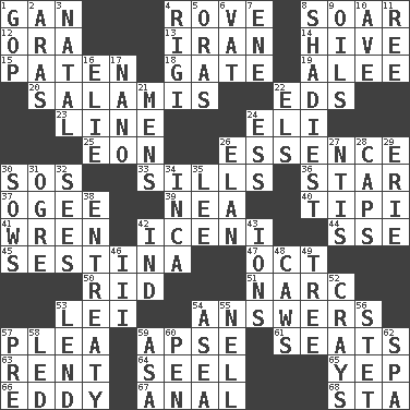 ACROSS 1. Separate the seeds from cotton 4. Be footloose 8. Fly high 12. Mouth or opening 13. SW Asia republic 14. Hub of activity 15. Eucharist need 18. Yard entry 19. Toward shelter 20. Deli grouping 22. Begley and Asner 23. Actor's bit 24. Biblical high priest 25. Age 26. Core 30. Distress signal 33. Beverly of Met fame 36. Play the lead 37. Double curve, resembling the letter S 39. Teachers' org. 40. Native american tent (variation) 41. Songbird 42. Ancient Celtic tribe of eastern Britain 44. Compass dir. 45. French poetic form 47. Sep. follower 50. To free from 51. Drug cop 53. Flowery wreath 54. Responses 57. Entreaty 59. Domed church section 61. Theater features 63. Monthly bill 64. Sew up the eyelids of hawks and falcons 65. Slangy assent 66. Whirlpool 67. Of or related to the anus 68. R.R. building DOWN 1. Republican Party 2. Ancient river in northeast Turkey 3. Relating to or accompanying birth 4. Swiss mountan, "Queen of the Mountains" 5. Mouths or openings 6. Large container 7. Compass dir. 8. Most dubious of character or honesty 9. Lubricates 10. "___ Maria" 11. To sift 16. Writer Wiesel 17. Billionth: prefix 21. Not women's 22. Raised railways 24. Curvy letter 26. Flair 27. Nuclear Threat Initiatives 28. Smile enhancers 29. 4th largest of the Great Lakes 30. Sty mamas 31. Legendary monster 32. Observes 34. South American Indian 35. Area sheltered from the wind 38. Plea 42. Working for oneself (abbr.) 43. Charged particles 46. One more than two 48. Crow sounds 49. Relationship diagram 52. Trading vessels 53. Grant temporary use of 54. At sea 55. 1994 drama film starring Jodie Foster 56. Proofreading order 57. Before (prefix) 58. Directed 59. White ___ sheet 60. Writing instrument 62. Health resort