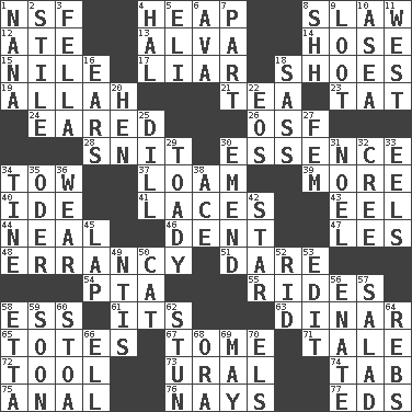 ACROSS 1. Science/research agcy. 4. Pile 8. Cole _ (cabbage dish) 12. Had dinner 13. Inventor's middle name 14. Stockings 15. The longest river in the world 17. One who doesn't tell the truth 18. Imelda's hoard 19. Assad's deity 21. Beverage made from leaves 23. Make lace 24. Having ears or earlike features 26. Order of Saint Francis (abbr.) 28. In a ____ (agitated or irritated) 30. Center 34. Pull behind 37. Rich soil 39. Greater amount 40. Binary compound 41. Shoestrings 43. Snakelike fish 44. Anneal 46. Scratch 47. French article 48. Tendancy to err 51. Have the gumption 54. Parent Teacher Assoc. 55. Amusement-park features 58. Double-curved letter 61. It is 63. Middle Eastern gold or silver currency 65. Hauls 67. Heavy book 71. Lie 72. Instrument 73. Mountain range 74. Bar bill 75. Of or related to the anus 76. Negative votes 77. Begley and Asner DOWN 1. Nanny 2. Vertical member of a panel or frame 3. Man or boy (slang) 4. Actor Linden 5. Connecticut Ivy Leaguer 6. Actress Gardner 7. Piece 8. Quiet! 9. Spoils 10. At sea 11. Compass direction 16. Hearing organs 18. Backtalk 20. Layer 22. Greek goddess of the dawn 25. Deli pickle 27. Opposite of masc. 29. Sycophant 30. Make improvements or corrections to 31. Christmas carol 32. Algonquian 33. Snakelike fish 34. Prong on a fork 35. River in Europe 36. Put on (as clothing) 38. Adept person 42. Play the lead 45. Infant locale 49. Nuclear Threat Initiatives 50. Domesticated feline 52. To free from 53. Prepare for publication 56. Maternal 57. Vegetable dish 58. Singer James 59. Within a short period 60. Portico 62. Astound 64. Confederate soldiers (slang) 66. Pipe bend 68. Mouth or opening 69. Can I? 70. Raised railways