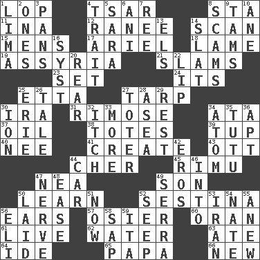 ACROSS 1. Trim (branches) 4. Russian ruler of old 8. R.R. building 11. _ tizzy (2 wds.) 12. The wife of a rajah (variant) 14. Examine hastily 15. Not women's 17. Satellite of Uranus 18. Unable to walk 19. Nineveh was its capital 21. Criticizes harshly 23. Put into a specified state 24. ___ a Wonderful Life 25. Singer James 27. Canvas cover 30. Retirement account (abbr.) 31. Full of chinks, cracks, or crevices 34. "One Day ___ Time" 37. Petroleum 38. Lugs 39. Uncastrated adult male sheep 40. Born 41. Cause to be 43. Baseball player Mel 44. "Mermaids" star 45. Tall New Zealand timber tree 47. Teachers' org. 49. Male offspring 50. Memorize 52. French poetic form 56. Hearing organs 57. Flexible twig of a willow tree 60. Northwest Algerian city 61. Not recorded 62. Wetness 63. Had dinner 64. Binary compound 65. Dad 66. ___ Haven, CT DOWN 1. Pale green bean 2. Washington bills 3. Zero-star reviews 4. Distinguishing feature 5. "Two Mules for Sister ____" 6. Cuckoo 7. To separate or throw off 8. Fraudulent business schemes 9. Scottish caps 10. One (Scot) 13. Raised railways 14. Narrow board 16. System (abbr.) 20. Located in or toward the back 22. Mouth edge 25. One of the Great Lakes 26. Falsehood 27. Carrier 28. Toward the sea 29. State of inaction 30. Electrically charged atom 32. Hankering 33. Greater amount 34. Smallest unit of an element 35. Ballerina skirt 36. Fitting 42. Greek god of love 44. 4-wheeled motor vehicle 46. To the inside or interior of 47. Effrontery 48. Comfort 49. Spanish missionary in California 50. Put down 51. At this time 52. Ooze 53. SW Asia republic 54. Nathan's nickname 55. Afresh 56. Connecticut Ivy Leaguer 58. Plant excrement 59. Call ___ day
