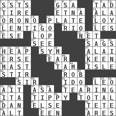 ACROSS 1. Fast planes 5. Girls' org. (abbr.) 8. Bit 11. Become fatigued 12. Inactive volcano in Sicily 14. According to 15. U. of Maine site 17. Food holder 18. Myrna of the movies 19. Small, flat, pigmented spot on the skin 21. _ de Janeiro 22. French article 23. Compass dir. 24. Chop off 25. Remaining after all deductions 27. Observe 28. Settles 31. Pile 35. Symbol (abbr.) 37. Jai _ 38. Celtic language 39. Hearing organ 41. Peachy ____! 42. Vertical spar for supporting sails 43. Scottish cap 45. Small island 46. Use a spoon 47. Director Reiner 49. Title for a knight 51. Wedding promise 52. Lion 55. Small island 57. White ___ sheet 60. Separating forcefully 62. Call ___ day 63. Likely to tip or tilt 65. "_____ Recall" 66. Daniel's nick name 67. Otherwise 68. False hair 69. The first octave above the treble staff 70. Car or cant ending 71. Ancient Greek god of war DOWN 1. Took without asking 2. Male parents of animals 3. Marketplace scale 4. Transmitted 5. Set 6. Play the lead 7. Opposed to 8. Baron Munchausen's specialties 9. Medicinal plant 10. 24-hour periods 13. Age 16. Petroleums 17. Wimpy's pal 20. Leaves 26. 1973 Nobel Price Winner (Physics) Leo 29. Highlander 30. Trig term 31. Cloth borders 32. Part of Q.E.F. 33. Helper 34. _ dish (used to culture cells) 36. Floor covering 40. Noteworthy scarcity 44. Method 48. Water vessel 50. Assign a rank or rating to 52. 61 cubic inches 53. Related on the mother's side 54. Stares at amorously 55. Opera by Verdi 56. Slanted text style (abbr.) 58. Filth; sediment 59. Domed church section 61. Round or rotation of duties 64. Writing instrument