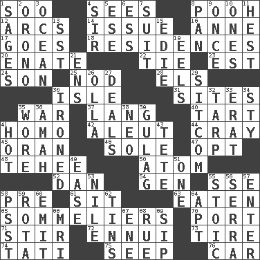ACROSS 1. "Barney Miller" actor Jack 4. Observes 8. "Silly old bear" 12. Curves 14. Come out of 16. Singer Murray 17. Moves 18. Dwellings 20. Related on the mother's side 22. Standoff 23. Eastern Standard Time (abbr.) 24. Male child 25. Allow head to fall sleepily 28. Raised railways 30. Small island 31. Locates 35. Armed conflict 37. Long (Scottish) 40. Small pie 41. Like (prefix) 42. Eskimo relative 44. Supercomputer manufacturer 45. NW Algerian seaport 46. Not divided or shared with others 47. Elect 48. Giggle 50. Smallest unit of an element 52. Daniel's nick name 54. Commissioned mil. rank 55. Compass dir. 58. Before (prefix) 61. Be seated 63. Eroded 65. Wine waiters 70. Left side of a ship or aircraft 71. Use a swizzle stick 72. World-weariness 73. Hoop that covers a wheel 74. Jacques of French films 75. Ooze 76. Automobile DOWN 1. Gurus 2. U. of Maine site 3. Sea 4. Title for a knight 5. Compass dir. 6. Double-curved letter 7. Costume for a special activity 8. Baking dish 9. Single time 10. Washington bills 11. Behest 13. Fast jet (abbr.) 15. Singer Brickell 19. Snakelike fish 21. Followers of ems 26. Rounded earthenware pot or jar 27. Allots cards 29. "Cheers" or "Ellen" 30. Pressed 32. Canvas cover 33. Part of Q.E.F. 34. Filthy place 35. Had on 36. Nanny 38. Modern: prefix 39. Russian prison camp 41. Being at a high temperature 43. False hair 49. Relaxation 51. Single 53. The longest river in the world 55. Unemotional 56. Spanish missionary in California 57. Keyboard key 58. Inconspicuous attention getter 59. Round or rotation of duties 60. Give off 62. Airtight sealed metal containers 64. Fitting 66. Medical imaging device (abbr.) 67. Compass dir. 68. Sorrow 69. Small drink