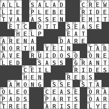 ACROSS 1. 100% 4. Vegetable dish 9. Group working together 13. Whopper 14. Cadet 15. Travel on an animal 16. Federal power corp. 17. NE Netherlands city 18. Send forth 19. And so on (abbr.) 21. Baseball player Mel 22. Gospel singer Marvin 24. Aid 26. Consume 27. Sports stadium 29. Have the gumption 30. Compass direction 31. Distinctive style or manner 33. Bar bill 36. "___ Maria" 37. Boisterous (Brazilian Portuguese) 40. Single 41. Directed 42. Backtalk 43. Let have 45. To provide with a ceiling 47. Amusement-park features 48. Layer 49. Confederate soldiers (slang) 50. Amid 52. Compass dir. 54. R.R. building 56. Butter sub 57. Desist 59. Mouth or opening 61. Groovy apts. 62. Components 63. Rowing implement 64. Woody plant 65. Ascend 66. Potassium hydroxide DOWN 1. Keyboard modifier key 2. Moving, as bait 3. Resembling or made to resemble leather 4. Health resort 5. Columnist Joseph or Stewart 6. For fear that 7. Collude with 8. Lair 9. Make 10. Basketball hoops 11. Singer Brickell 12. Soggy 20. Penny 22. Seines 23. Hearing organ 25. Cowardly lion portrayer 27. Of or related to the anus 28. Be footloose 29. "Vaya con ____" 31. Small bottle 32. Begley and Asner 33. Inedible or poisonous agaric 34. Queen of England 1702-14 35. Antes 38. Putting into practice 39. Legendary monster 44. Teases 45. Opt 46. Car or cant ending 49. Musical pauses 50. Having or resembling wings 51. Ancient Persian 52. Singe 53. Indian skirt 55. Like ___ of sunshine 56. Choose 57. Tax preparer (abbr.) 58. Compass dir. 60. "We ___ not amused" (Victoria)