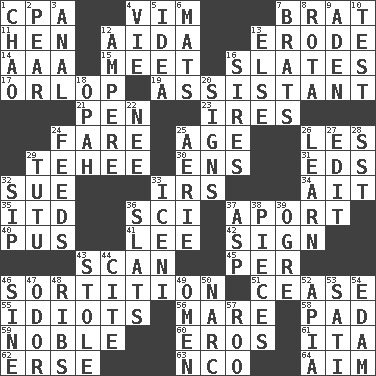 ACROSS 1. Accounting whiz (abbr.) 4. Zeal 7. Naughty child 11. Layer 12. Opera by Verdi 13. Eat (away) 14. American Automobile Association (abbr.) 15. Rendezvous 16. Chalkboards 17. Lowest deck of a ship 19. Helper 21. Animal enclosure 23. Angers 24. Conductor's collection 25. Mature 26. French article 29. Giggle 30. Followers of ems 31. Begley and Asner 32. Institute legal proceedings 33. Big collection agency 34. Small island 35. It would 36. _-fi 37. To the left, to Queeg 40. Festering 41. Area sheltered from the wind 42. Attach a signature 43. Skim 45. For each 46. Determination 51. Desist 55. Foolish or stupid persons 56. Female horse 58. Groovy apt. 59. Impressive in appearance 60. Greek god of love 61. Call ___ day 62. Celtic language 63. Non-commissioned officer (abbr.) 64. Direct toward a target or goal DOWN 1. US Secretary of Labor Elaine L. _ 2. Lightbulb-shaped fruit 3. Of or related to the anus 4. Compete 5. The content of cognition 6. Floor protectors 7. Naughty children 8. Roll call or roster of names 9. Arabian gulf 10. Trial 12. Electrical Unit 13. Otherwise 16. Titles for men of rank and authority 18. Brightly colored fish 20. Attaches a signature 22. Born 24. Gives food to 25. Nest on high 26. Acquire or gain knowledge or skills 27. Prepare for publication 28. Fast jet (abbr.) 29. Ballerina skirt 32. Small drink 33. Ancient Celtic tribe of eastern Britain 36. Narrow boards 37. Cleo's killer 38. Components 39. Legendary monster 43. Fur scarf 44. Quote 46. Trig term 47. Scent 48. Chest bones 49. Sign of things to come 50. Drug cop 52. Capital of Western Samoa 53. Suttee (variant) 54. Dutch treat 57. Friend of Pooh