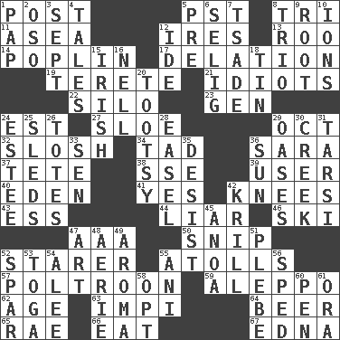 ACROSS 1. Mail 5. Pacific Standard Time (abbr.) 8. Three (prefix) 11. At sea 12. Angers 13. Friend of Pooh 14. Cotton for raincoats, e.g. 17. Conveyance 19. Cigar-shaped 21. Foolish or stupid persons 22. Grain storage tower 23. Commissioned military rank (abbr.) 24. Eastern Standard Time (abbr.) 27. A type of plum 29. Sep. follower 32. Make a splashing sound 34. Bit 36. "Two Mules for Sister ____" 37. Wig 38. Compass dir. 39. One who uses or employs something 40. Paradise 41. Affirmative reply 42. Leg joints 43. Double-curved letter 44. One who doesn't tell the truth 46. What Jean-Claude Killy likes to do 47. American Automobile Association (abbr.) 50. Sever or remove by pinching or nipping 52. A viewer who gazes fixedly 55. Ringlike coral islands and reefs 57. Coward 59. City in Syria 62. Grow older 63. Body of Kaffir warriors 64. Fermented drink made from hops 65. Actress Charlotte 66. Erode 67. Pulitzer Prize-winning author Ferber DOWN 1. Infant food 2. Bear (Spanish) 3. Back-to-school mo. 4. Falsehoods 5. Before (prefix) 6. Major League Baseball Commissioner Bud 7. Sadhe (variant) 8. Musical group of three 9. Carrot, for example 10. Charged particles 12. Binary compound 15. From or relating to Ireland 16. 1994 drama film starring Jodie Foster 18. Shallow baking pan 20. A girl or young woman (variant) 24. First name in cosmetics 25. Bobsleighs 26. Lugs 28. Artist's stand 29. Fertile tracts in a desert 30. Small stream 31. Tarsus (plural) 33. Elected rep. 35. Cease 36. Player for Phoenix 42. The principal food of baleen whales 45. Small Philippine buffalo 47. Tate display 48. Nest on high 49. Odor 51. Cadet 52. Practice fight 53. Ancient Roman robe 54. Toward shelter 55. Cuckoo 56. Drove too fast 58. Elect 60. Writing instrument 61. Mouth or opening