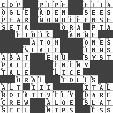 ACROSS 1. Police officer (slang) 4. Corncob 8. Singer James 12. Stare 14. Arabian gulf 15. Observes 16. Lightbulb-shaped fruit 17. Unrelated to defense, as in spending 20. Stalk of a moss capsule 21. Mouth or opening 22. Parent Teacher Assoc. 23. Principle of right and wrong 27. Queen of England 1702-14 29. Tiny particle 31. Singles 34. Schedule 35. Taverns 36. Blind as ____ 39. Australian flightless bird 41. System (abbr.) 42. Light colored 43. Foe 46. Lie 47. Louse (plural) 48. Taken by mouth 51. For Whom the Bell _____ 54. Keyboard modifier key 56. One more than two 58. Slanted text style (abbr.) 61. Happening in regular succession 66. Have the gumption 67. Ship's personnel 68. Medicinal plant 69. Narrow board 70. Sew up the eyelids of hawks and falcons 71. Cuts off 72. Curvy letter DOWN 1. 911 reaches them 2. Double curve, resembling the letter S 3. Food holder 4. Baking dish 5. Wedding promise 6. Animal enclosure 7. Inside; within (prefix) 8. Compass dir. 9. 3-inch nail 10. Trial 11. Toward the sea 13. Part of Q.E.F. 18. Epoch 19. Air blower 24. Actor Linden 25. Call ___ day 26. ____ d'Azur (French Riviera) 28. Annoyingly loud 30. Klaipeda city 32. Followers of ems 33. Fast jet (abbr.) 34. Guide 36. Fitting 37. Sound made by sheep 38. One to whom something is allotted 40. A single undivided whole 44. Environmental prefix 45. Cartoonist voice _ Blanc 49. Small island 50. Cards in a Roman deck? 52. Flaplike coverings 53. Having lost freshness 54. Arches 55. Old wives' tales, e.g. 57. _ the terrible 59. Caspian sea tributary 60. Allows 62. Leather borer 63. Connecticut Ivy Leaguer 64. Chop off 65. It is so
