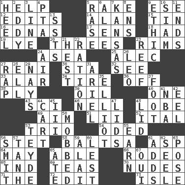 ACROSS 1. Aid 5. Libertine 9. Compass dir. 12. Prepares for publication 14. ____ Jay Lerner 15. Shallow baking pan 16. Ferber et al. 17. Elected reps. 18. Possessed 19. Potassium hydroxide 20. Threesomes 23. Basketball hoops 24. At sea 25. Actor Baldwin 27. Painter Guido (1575-1642) 30. R.R. building 32. Observe 33. Having or resembling wings 34. Hoop that covers a wheel 36. No longer planned or scheduled 38. Apply oneself diligently 39. Petroleum 40. Single 43. _-fi 46. 1994 drama film starring Jodie Foster 48. Ear part 49. Direct toward a target or goal 51. Cards in a Roman deck? 52. Slanted text style (abbr.) 53. Musical group of three 54. Wrote a lyric poem 56. Proofreading order 58. Greek mezzo-soprano Agnes 61. Cleo's killer 64. Can I? 65. Competent 66. Cowboy competition 68. Indiana (abbr.) 69. Afternoon social gatherings 70. Unclothed pictures 71. Definite Article 72. Prepare for publication 73. Capri or Wight DOWN 1. Person who is morally reprehensible 2. Whirlpool 3. Actor's bit 4. Parent Teacher Assoc. 5. To erase 6. Toward shelter 7. Sunflower state 8. Followers of ems 9. Principle of right and wrong 10. Thailand, formerly 11. Conclusions 13. Fast planes 21. Behest 22. Food allowance for one day 23. Coral ridge 24. Atmosphere 26. Lion 27. Reproach for some lapse or misdeed 28. Pipe bend 29. Negative votes 31. Satellite of Uranus 35. American author Paul (1891-1958) 37. One third of a yard 41. Basketball assoc. 42. Snakelike fish 44. Heavy open wagon 45. One more than two 47. Hats (slang) 48. Hat (slang) 50. Crowded into 53. Miss Universe 1986, Barbara Palacios _ 55. Merit 56. Stricken, poetically 57. Hyperbolic tangent 59. Jai _ 60. For fear that 61. Sums up 62. Sew up the eyelids of hawks and falcons 63. Introduce or present, as a question 65. Had dinner 67. Fr. "Yes"