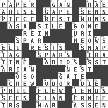 ACROSS 1. Some stationery 6. Separate the seeds from cotton 9. Actress Charlotte 12. Get up 13. Yawn 14. Elected reps. 15. Part 16. Repose 17. Religious women 18. White ___ sheet 19. Drop; flow; fall 20. Went 21. It's straight from the horse's mouth 23. RI univ. 24. Coast Guard woman 25. Catcalls? 28. Biblical high priest 30. Musical pauses 34. Fastener 35. Label 36. Practice fights 38. Retirement account (abbr.) 39. Prong on a fork 41. Goodbye (Sp.) 43. Fast jet (abbr.) 44. Believer in; advocate of (suffix) 46. Egg locale 48. Bear (Spanish) 49. Yard entry 50. Ship's personnel 51. Aroma 53. Expire 56. Silvers or Donahue 57. Soared 58. Is inclined (to) 60. Perceives with the eye 61. Flair 62. Bert's buddy 63. Big collection agency 64. Spoil 65. NE Netherlands city DOWN 1. Infant food 2. Operatic vocal solo 3. Sliced desserts 4. Fortification 5. To separate or throw off 6. Highlander 7. Domed church section 8. Fish or hair follower 9. One who advocates reunion 10. Queen of England 1702-14 11. Double-curved letter 13. Smile widely 14. Sounds asleep 19. Fathers 20. Chewing product 22. Hearing organ 24. Seigniories (variant) 26. Armed conflicts 27. Petty quarrel 28. Singer James 29. Den 31. Health resort 32. Small amount or degree 33. Indian title of respect (Mr.) 37. Underwater navigation system 40. Artist's stands 42. Put into a specified state 45. At this time 47. Spring feasts 49. Long dress 50. "Mermaids" star 51. Spanish pot 52. Letter starter 54. Lodging establishments 55. Singer Brickell 56. 23rd letter of the Greek alphabet 57. Opposite of masc. 58. Beverage made from leaves 59. Elected rep.