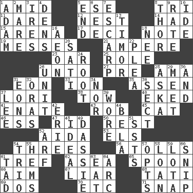 ACROSS 1. Among 5. Compass dir. 8. Three (prefix) 11. Have the gumption 12. A home for chicks 14. Possessed 15. Sports stadium 17. Tenth: prefix 18. Make mention of 19. Makes clutter 21. Electrical Unit 23. Boat paddle 25. Hero or heavy, e.g. 26. To (old English) 27. Before (prefix) 28. Nanny (var.) 31. Period of immesurable duration 33. Electrically charged atom 35. NE Netherlands city 37. Australian parrot (variant) 38. Pull behind 40. Supplemented with great effort 41. Maternal 43. Director Reiner 45. Domesticated feline 46. Double-curved letter 47. To free from 50. Relief 52. Opera by Verdi 53. Raised railways 54. Triads 56. Ringlike coral islands and reefs 61. Unclean, religiously 62. At sea 65. Soup utensil 66. Direct toward a target or goal 67. One who doesn't tell the truth 68. Jacques of French films 69. Two (Sp.) 70. And so on (abbr.) 71. Fastener DOWN 1. First man 2. Female horse 3. Angers 4. Cub Scout units 5. Conclude 6. Observe 7. Fortification 8. Son of Odin 9. Assign a rank or rating to 10. Binary compound 13. The easternmost of the Lesser Sundas 16. Period of immesurable duration 18. Born 20. Suttee (variant) 22. Entreaty 24. Carrot, for example 26. A single undivided whole 28. "____ silly question..." 29. Confront 30. Added to 31. Immeasurably long periods of time 32. Mouths or openings 34. Not either 36. Religious group 37. Area sheltered from the wind 39. Had on 42. One of the Great Lakes 44. Actor Lugosi 48. Perfect 49. Hyrax 51. Fast planes 52. Sandy's bark 54. Musical group of three 55. Folds over and sews together 57. Elects 58. Grant temporary use of 59. Globular water bottle used in Asia 60. Sever or remove by pinching or nipping 61. Small amount or degree 63. Erode 64. Curve