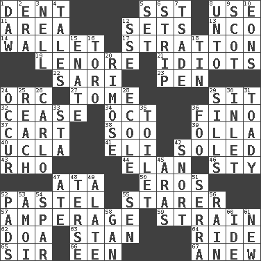 ACROSS 1. Gouge 5. Fast jet (abbr.) 8. Purpose 11. Length times width 12. Puts into a specified state 13. Non-commissioned officer (abbr.) 14. Place for singles 17. Ski resort town in Vermont 19. Poe poem 21. Foolish or stupid persons 22. Indian skirt 23. Fenced enclosure 24. The grampus (Milton) 27. Heavy book 29. Be seated 32. Stop 34. Sep. follower 36. Fine (Spanish) 37. Heavy open wagon 38. "Barney Miller" actor Jack 39. Spanish pot 40. Southern CA. univ. 41. Biblical high priest 42. Having a sole or soles 43. 17th letter of the Greek alphabet 44. Style 46. Filthy place 47. _ moment's notice (2 wds.) 50. Greek god of love 52. Soft color 55. A viewer who gazes fixedly 57. Electrical Measurement 59. Put through a sieve 62. ___ good deed 63. Comedian Laurel of Laurel & Hardy 64. Travel on or in a vehicle 65. Title for a knight 66. Car or cant ending 67. Afresh DOWN 1. Obsolete 2. Epoch 3. 1994 drama film starring Jodie Foster 4. Stories 5. Arrange properly for use 6. Remove all contents or possession from 7. Sadhe (variant) 8. To (old English) 9. Highlander 10. Immeasurably long periods of time 12. Compass dir. 15. Related on the mother's side 16. "Corrida" creature 18. Metal container 20. Full of chinks, cracks, or crevices 24. Come to pass 25. Arrive at 26. Monte _, Las Vegas Hotel/Casino 28. Learning spot: Fr. 29. Beverly of Met fame 30. An arm off of a larger body of water 31. Sycophant 33. R.R. building 35. Bathroom plumbing fixture 36. Egg _ yung 42. Derisive sound 45. Caspian sea tributary 47. Had dinner 48. Laconic 49. Having winglike extensions 51. Spanish missionary in California 52. Groovy apts. 53. Mine, in Marseilles 54. Coast Guard woman 55. Elected rep. 56. Precipitation 58. Separate the seeds from cotton 60. Binary compound 61. ___ Haven, CT