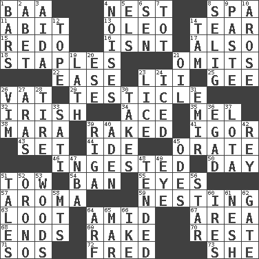 ACROSS 1. Sound made by sheep 4. A home for chicks 8. Health resort 11. "This won't hurt ____!" 13. Butter sub 14. Pull into pieces 15. Do over again 16. Is not 17. In addition 18. Paper fasteners 21. Leaves out 22. Comfort 23. Cards in a Roman deck? 25. Unit of force equal to gravity 26. Large container 29. One of the two male reproductive glands 32. From or relating to Ireland 34. Adept person 35. Cartoonist voice _ Blanc 38. Hindu Mythology: god of death 39. Moved through 41. Russian composer Stravinsky 43. Put into a specified state 44. Binary compound 45. Speak pompously 46. Eaten 50. 24 hours 51. Pull behind 54. Bar 55. Sight organs 57. Scent 59. Snuggling 63. Plunder 64. Among 67. Type of rug 68. Extremities 69. Libertine 70. Remainder 71. Distress signal 72. Flintstone 73. A female animal or person DOWN 1. Oblong pieces of solid material 2. Collude with 3. Opera by Verdi 4. Annoying sounds 5. Raised railways 6. Elected rep. 7. Small child 8. Major League Baseball Commissioner Bud 9. Thick mixture 10. Came up 12. Drink excessively 14. Scottish cap 19. Thin strip of wood or metal 20. Compass dir. 21. Petroleum 23. Louse (plural) 24. On the rocks 26. Zeal 27. Ancient river in northeast Turkey 28. Hoop that covers a wheel 30. Receives possession of 31. Independent ruler or chieftain 33. Suttee (variant) 36. Mild oath 37. Globular water bottle used in Asia 39. Capital of Latvia 40. Arabian gulf 42. Marina Del _, California 45. Lyric poems 47. Basketball assoc. 48. Watched over 49. Sight organ 51. Stories 52. U. of Maine site 53. Forest 56. Play the lead 58. Mountains (abbr.) 60. Angers 61. Tender 62. Yard entry 64. Sandy's bark 65. Make imperfect 66. D.D.E's nickname