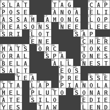ACROSS 1. Narrow board 5. Label 8. Head covering 11. Airs 12. Small Philippine buffalo 14. Biblical high priest 15. Indian state 17. Amid 18. Trim (branches) 19. Thinks logically 21. Born 22. Area sheltered from the wind 23. _ Lanka 24. Car dealer's back yard 25. Plant excrement 27. Compass dir. 28. "Mermaids" star 31. Floor coverings 35. The grampus (Milton) 37. Casino tip 38. Of the mouth 39. Health resort 41. Washington bills 42. Actor Lugosi 43. Everything 45. Egg locale 46. Table seasoning 47. Greek goddess of the dawn 49. Beverage made from leaves 51. Before (prefix) 52. Compass dir. 55. Call ___ day 57. Infant locale 60. Player piano 62. Cartoonist voice _ Blanc 63. Greek god of the underworld 65. Echolocation 66. Had dinner 67. Grain storage tower 68. Singer Brickell 69. It is so 70. The 23rd letter of the Hebrew alphabet 71. Grant temporary use of DOWN 1. Practice fights 2. Failure 3. Slender Brazilian palm 4. Afternoon social gatherings 5. Scottish cap 6. At once, immediately (arch.) 7. Went 8. Portable communications device 9. _ vera 10. Corncob 13. Matures 16. Undercover agent 17. Michaelmas daisies 20. Words to Nanette 26. Gambison 29. Makes supply last 30. State of inaction 31. Crowds into 32. Type of rug 33. Baron Munchausen's specialties 34. Chalkboard 36. Tax preparer (abbr.) 40. City in Syria 44. Australian parrot (variant) 48. Oceans 50. High mountains 52. Something which is sent 53. Killed 54. Having ears or earlike features 55. "If ____ say so..." 56. Wig 58. Came down and settled, as after flight 59. Monetary unit of Botswana 61. Christmas carol 64. Pull behind