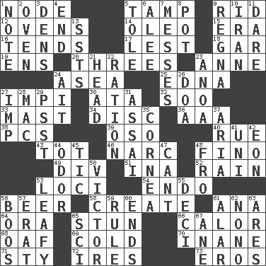 ACROSS 1. Thickened enlargement 5. Pack (down) 9. To free from 12. Baking chambers 14. Butter sub 15. Period 16. Watches over 17. For fear that 18. Slender fish 19. Followers of ems 20. Threesomes 23. Queen of England 1702-14 24. Toward the sea 25. Pulitzer Prize-winning author Ferber 27. Body of Kaffir warriors 30. _ moment's notice (2 wds.) 32. "Barney Miller" actor Jack 33. Vertical spar for supporting sails 34. Flat circle 36. American Automobile Association (abbr.) 38. Personal Computers (abbr.) 39. Bear (Spanish) 40. Sorrow 43. Small child 46. Drug cop 48. Fine (Spanish) 49. HTML Container Element 51. _ tizzy (2 wds.) 52. Precipitation 53. Venues 54. Inside; within (prefix) 56. Fermented drink made from hops 58. Cause to be 61. Santa ___, CA 64. Mouth or opening 65. Astound 66. Bodily heat indicating an inflammation 68. Clumsy lout 69. Lacking warmth 70. Lacking in sense or substance 71. Filthy place 72. Angers 73. Greek god of love DOWN 1. Musical sound 2. Baking chamber 3. Hiding places for outlaws 4. Conclusion 5. Lacquered or enameled metalware 6. Toward shelter 7. Makes clutter 8. Plant holder 9. Rain (Swedish) 10. SW Asia republic 11. Have the gumption 13. Fast planes 21. Froth on beer 22. Food allowance for one day 23. Small Philippine buffalo 24. Small island 26. ___ good deed 27. Naughty child 28. Apple computer (short form) 29. Inconspicuous attention getter 31. Slender Brazilian palm 35. Pupil covering 37. Operatic vocal solo 41. Corn or form start 42. Period of immesurable duration 44. Scent 45. Nervous spasm 47. Patter 48. From 50. Winning man's name 53. Like summer trees 55. Tenth: prefix 56. Scornful sounds 57. Part of Q.E.F. 59. General guideline 60. Conclusions 61. Having or resembling wings 62. Words to Nanette 63. Ancient Greek god of war 65. _-fi 67. A saturated hydrocarbon