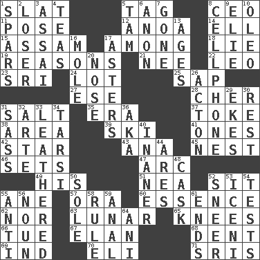 ACROSS 1. Narrow board 5. Label 8. Corporate head (abbr.) 11. Introduce or present, as a question 12. Small Philippine buffalo 14. Pipe bend 15. Indian state 17. Amid 18. Falsehood 19. Thinks logically 21. Born 22. Lion 23. _ Lanka 24. Car dealer's back yard 25. Plant excrement 27. Compass dir. 28. "Mermaids" star 31. Table seasoning 35. Period 37. Puff or smoke 38. Length times width 39. What Jean-Claude Killy likes to do 41. Singles 42. Play the lead 43. Santa ___, CA 45. Egg locale 46. Arranges properly for use 47. Curve 49. Part of HMS, perhaps 51. Teachers' org. 52. Be seated 55. One (Scot) 57. Mouth or opening 60. Core 62. And not 63. Type of eclipse 65. Leg joints 66. Third day of the wk. 67. Style 68. Incision 69. Working for oneself (abbr.) 70. Connecticut Ivy Leaguer 71. Indian titles of respect DOWN 1. Practice fights 2. Failure 3. Slender Brazilian palm 4. Beverages made from leaves 5. Scottish cap 6. Soon (poet.) 7. Went 8. Portable communications device 9. Writer Wiesel 10. Butter sub 13. Eras 16. Undercover agent 17. Michaelmas daisies 20. Sense of smell 26. 13-14th century defensive garment 29. Makes supply last 30. Take ten 31. Backtalk 32. Johnson of "Laugh-In" 33. Resembling or made to resemble leather 34. Tarsus (plural) 36. Alias (abbr.) 40. More empty; more void 44. Ancient Greek god of war 48. Keg 50. Not divided or shared with others 52. Scornful expression 53. Ancient Celtic tribe of eastern Britain 54. Trials 55. Against 56. Part of speech 58. Governing power 59. Of or related to the anus 61. Conclusions 64. Cuckoo