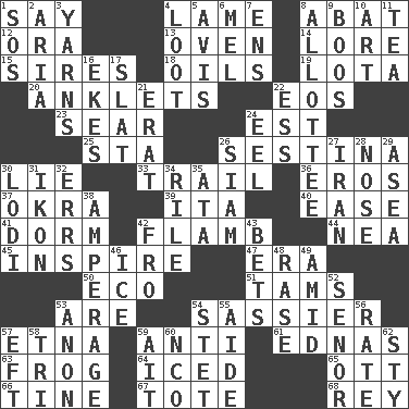 ACROSS 1. Declare 4. Unable to walk 8. Blind as ____ 12. Mouth or opening 13. Baking chamber 14. Old wives' tales, e.g. 15. Male parents of animals 18. Lubricates 19. Globular water bottle used in Asia 20. Short socks 22. Greek goddess of the dawn 23. Singe 24. Eastern Standard Time (abbr.) 25. R.R. building 26. French poetic form 30. Falsehood 33. Lag or linger behind 36. Greek god of love 37. Gumbo ingredient 39. Call ___ day 40. Comfort 41. Dormintory (informal) 42. Flambe (short form) 44. Teachers' org. 45. Heighten or intensify 47. Period 50. Environmental prefix 51. Scottish caps 53. "We ___ not amused" (Victoria) 54. More lively and spirited 57. Inactive volcano in Sicily 59. Against 61. Ferber et al. 63. Toadlike animal 64. On the rocks 65. Baseball player Mel 66. Prong on a fork 67. Carryall 68. Marina Del _, California DOWN 1. Distress signal 2. Roberta Peters solo 3. Entertaining tales 4. Plunder 5. Opinion 6. Cartoonist voice _ Blanc 7. Followers of ems 8. One to whom something is allotted 9. Scornful sounds 10. Tate display 11. Afternoon social gathering 16. Makes supply last 17. Narrow board 21. Part of Q.E.F. 22. Double-curved letter 24. Snakelike fish 26. Thailand, formerly 27. SW Asia republic 28. Characteristic smell of wine 29. Toward the sea 30. Farming town in central California 31. Picture 32. Blunders 34. Cause heat under the collar 35. "One Day ___ Time" 38. Electrical Measurement 42. Away 43. Stakes 46. Frozen water 48. Raze (variant) 49. Among 52. Sir (Sp.) 53. Soon (poet.) 54. Proofreading order 55. Assistant 56. Pace 57. Lizard (obsolete) 58. Three (prefix) 59. Small island 60. Non-commissioned officer (abbr.) 62. Filthy place