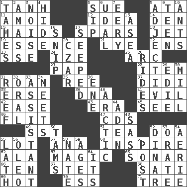 ACROSS 1. Hyperbolic tangent 5. Institute legal proceedings 8. "One Day ___ Time" 11. Mine, in Marseilles 12. It may be bright or harebrained 14. Lair 15. Women servants 17. Practice fights 18. Passenger plane 19. Substance 21. Potassium hydroxide 22. Followers of ems 23. Compass dir. 24. Ending with capital 25. Curve 27. Infant food 28. A whole individual unit 31. Wander 35. Portuguese money of account (variant) 37. "You Light Up My Life" star Conn 38. Celtic language 39. Heredity factor (abbr.) 41. Tending to cause great harm 42. Comfort 43. Period 45. Sew up the eyelids of hawks and falcons 46. Secret move to avoid paying debts 47. Music discs 49. Fast jet (abbr.) 51. Afternoon social gathering 52. ___ good deed 55. Car dealer's back yard 57. Santa ___, CA 60. Heighten or intensify 62. In the manner of 63. Mysterious quality of enchantment 65. Underwater navigation system 66. Nine, plus one 67. Proofreading order 68. Suttee (variant) 69. Being at a high temperature 70. Double-curved letter 71. Woody plant DOWN 1. Softens 2. Collect or gather 3. Annoying sound 4. Flintstone garb 5. Small drink 6. Freehold land 7. Suggestive of the supernatural 8. Descriptive word 9. Adolescent 10. Pismires 13. Toward the sea 16. Clip 17. Oozed 20. Russian ruler of old 26. Amusement-park features 29. Singer Brickell 30. Place where flour is made 31. Coral collection 32. Relating to the mouth 33. Aide 34. Confronts 36. Compass dir. 40. Northern region 44. An important port of Yemen 48. Backtalk 50. Scottish caps 52. Middle Eastern gold or silver currency 53. Speak pompously 54. Nest on high 55. Thin strip of wood or metal 56. Butter sub 58. Nathan's nickname 59. Ripens 61. Mail 64. It is
