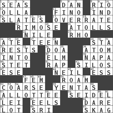 ACROSS 1. Oceans 5. Daniel's nick name 8. River (Sp.) 11. Spanish pot 12. Fine (Spanish) 13. Indiana (abbr.) 14. Chalkboards 17. Make much ado about nothing 19. Full of chinks, cracks, or crevices 21. Ringlike coral islands and reefs 22. The longest river in the world 23. 17th letter of the Greek alphabet 24. Had dinner 27. Adolescent 29. R.R. building 32. Musical pauses 34. ___ good deed 36. Smallest unit of an element 37. To the inside or interior of 38. Shade tree 39. California wine valley 40. Proofreading order 41. Reproach for some lapse or misdeed 42. Grain storage towers 43. Compass dir. 44. Famous astronaut Armstrong 46. Double-curved letter 47. Opposite of masc. 50. Wander 52. Unrefined 55. Gossips 57. One to whom something is allotted 59. Beer mug 62. Flowery wreath 63. Snakelike fish 64. Have the gumption 65. Car dealer's back yard 66. _ Lanka 67. Heroin DOWN 1. Distress signal 2. Pipe bend 3. Having or resembling wings 4. Smooth fabric 5. HTML Container Element 6. Approach 7. 0 degrees 8. Monetary unit of Yemen 9. International (abbr.) 10. Lyric poems 12. Enemy 15. Gives off 16. Not divided or shared with others 18. Friend of Pooh 20. Sowing specialist 24. Ascend 25. Portable shelters 26. First name in cosmetics 28. Pitcher Ryan 29. Showing deterioration from age 30. Traditional theme or motif 31. Collect or gather 33. Small child 35. Electrical Unit 36. Cuckoo 42. Chalkboard 45. Charged particles 47. Back 48. _____ Park, CO 49. Distance measurement 51. Women servants 52. Give a ring to 53. Margarine 54. Came down and settled, as after flight 55. It is so 56. Neighbor of Neb. 58. Connecticut Ivy Leaguer 60. Epoch 61. Part of a journey