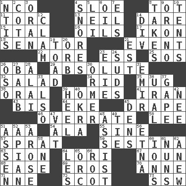 ACROSS 1. Non-commissioned officer (abbr.) 4. _ gin 8. Small child 11. Torque (variant) 13. Famous astronaut Armstrong 14. Have the gumption 15. Slanted text style (abbr.) 16. Lubricates 17. Picture 18. Elected representative 21. Happening 22. Greater amount 23. Curvy letter 25. Mayday 26. Chief or king in Benin or Nigeria 29. Utter; complete 32. Vegetable dish 34. To free from 35. Large cup 38. Taken by mouth 39. Residences 41. SW Asia republic 43. Twice 44. Make supply last 45. Window treatment 46. Make much ado about nothing 50. Area sheltered from the wind 51. Auto club (abbr.) 54. In the manner of 55. Trig term 57. Small fatty European fish 59. French poetic form 63. The Jewish people; Israel 64. Australian parrot (variant) 67. Part of speech 68. Comfort 69. Greek god of love 70. Queen of England 1702-14 71. Compass dir. 72. Native of Scotland 73. Compass dir. DOWN 1. Nuclear Threat Initiatives 2. ____ d'Azur (French Riviera) 3. Northwest Algerian city 4. Sounds asleep 5. Flowery wreath 6. Petroleum 7. Raised railways 8. Receives possession of 9. U. of Maine site 10. Portable shelters 12. Burrowing marine mollusk 14. HTML Container Element 19. Frog relative 20. Globe 21. Eastern Standard Time (abbr.) 23. Writer Wiesel 24. Beer foam 26. Bear (Spanish) 27. Sharp remark 28. Jai _ 30. Channel Islands abalone 31. Independent ruler or chieftain 33. In addition 36. Mountain range 37. Stare wonderingly 39. The bottom of a shoe or boot 40. Gumbo ingredient 42. Born 45. Lairs 47. Large container 48. Aid 49. Standoff 51. NE Netherlands city 52. Bee-related 53. Came up 56. Inactive volcano in Sicily 58. A saturated hydrocarbon 60. Charged atoms 61. Religious women 62. Afresh 64. French article 65. The grampus (Milton) 66. Friend of Pooh