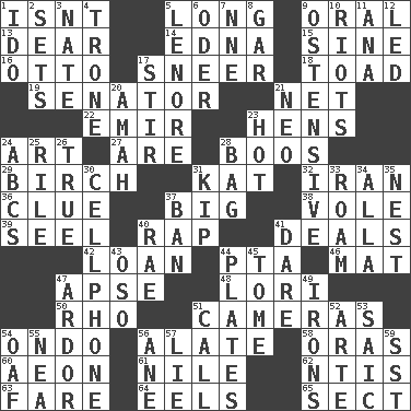 ACROSS 1. Is not 5. Having great length 9. Taken by mouth 13. Letter starter 14. Pulitzer Prize-winning author Ferber 15. Trig term 16. "Beetle Bailey" pooch 17. Scornful expression 18. Frog relative 19. Legislator 21. Remaining after all deductions 22. Arab leader 23. Coop moms 24. Tate display 27. "We ___ not amused" (Victoria) 28. Scornful sounds 29. A tree used for making furniture 31. Krazy ___ of comics 32. SW Asia republic 36. A slight indication 37. Large 38. Short-tailed, large-bodied rat 39. Sew up the eyelids of hawks and falcons 40. Strike 41. Allots cards 42. Grant temporary use of 44. Parent Teacher Association (abbr.) 46. Floor protector 47. Domed church section 48. Australian parrot (variant) 50. 17th letter of the Greek alphabet 51. Devices for capturing images 54. Southwest Nigerian state 56. Having winglike extensions 58. Mouths or openings 60. Period of immesurable duration 61. "Death on the ____" 62. Nuclear Threat Initiatives 63. Conductor's collection 64. Snakelike fish 65. Religious group DOWN 1. Wedding promise 2. Arranges properly for use 3. Nathan's nickname 4. Marketplace scale 5. Poe poem 6. Baltic tributary 7. Compass dir. 8. Slender fish 9. Clearly or manifestly demonstrative 10. Disturbances 11. Santa ___, CA 12. Directed 17. Use a spoon 20. Wet nurse 21. Modern: prefix 23. Being at a high temperature 24. Lettered men learn these first 25. Cause heat under the collar 26. Loyal 28. Container for groceries 30. Portable communications device 31. Sleep 33. Wander aimlessly 34. Silent film actress Nazimova 35. Egg locale 37. Bar 40. Actress Charlotte 41. Have the gumption 43. Bear (Spanish) 44. Food holders 45. Heavy book 47. Zeal 49. Metal shackles 51. Give a ring to 52. Johnson of "Laugh-In" 53. Ketch in the Levant 54. Clumsy lout 55. Teachers' org. 56. One (Scot) 57. Untruth 59. Fast jet (abbr.)