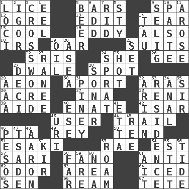 ACROSS 1. Louse (plural) 5. Soap units 9. Health resort 12. Legendary monster 13. Prepare for publication 14. Lacerate 15. Calm and collected 16. Whirlpool 17. In addition 18. Big collection agency 19. Boat paddle 21. Sets or collections 22. Indian titles of respect 24. A female animal or person 26. Unit of force equal to gravity 27. A sleeping potion; an opiate (poet.) 28. Blemish 29. Period of immesurable duration 30. To the left, to Queeg 32. Ancient river in northeast Turkey 36. 43,560 square feet 37. _ tizzy (2 wds.) 38. Painter Guido (1575-1642) 39. Helper 40. Related on the mother's side 42. Austrian river, tributary to the Danube 43. One who makes use of a thing 44. Get behind 46. Parent Teacher Assoc. 49. Marina Del _, California 50. Watch over 51. 1973 Nobel Price Winner (Physics) Leo 53. Actress Charlotte 54. Eastern Standard Time (abbr.) 57. Indian skirt 58. Papal veil 61. Against 62. Aroma 63. Length times width 64. On the rocks 65. Elected rep. 66. 480, 500 or 516 sheets of paper 67. False hair DOWN 1. Venues 2. Composer Stravinsky 3. What you're doing now 4. Snakelike fish 5. Fermented drink made from hops 6. Say or write further 7. To free from 8. Filthy place 9. Major League Baseball Commissioner Bud 10. Thick mixture 11. Came up 14. The 19th letter of the Greek alphabet 19. Petroleum 20. At sea 21. Arrange properly for use 23. Indian princess (variant) 24. Small fatty European fish 25. Being at a high temperature 27. Tenth: prefix 28. Echolocation 29. Auto club (abbr.) 31. Abounding in pines 32. Believer in; advocate of (suffix) 33. Dwelling 34. Of or related to the anus 35. Title for a knight 40. Compass dir. 41. Singer James 43. RI univ. 45. To sift 46. Mexican monetary units 47. Sadhe (variant) 48. Composer Copland 52. Apertif with cassis 53. Wander 55. Proofreading order 56. Event that recurs at intervals 58. Distant 59. "We ___ not amused" (Victoria) 60. Teachers' org. 61. Small island