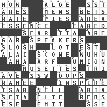 ACROSS 1. Cut the grass 4. Medicinal plant 8. Fast jet (abbr.) 11. Ancient Greek god of war 13. Not women's 14. Wagers 15. Assign a rank or rating to 16. Sliced desserts 17. Length times width 18. Gist 21. Having ears or earlike features 22. Shrivel 23. Call ___ day 25. "We ___ not amused" (Victoria) 26. Slender fish 29. Orators 32. Splash clumsily 34. Car dealer's back yard 35. Eastern Standard Time (abbr.) 38. Mountain range southwest of Kyrgyzstan 39. Biscuitlike quick bread 41. Chinese city south-southwest of Nanjing 43. Housemaid (var.) 44. Sandy's bark 45. The state of being joined or united 46. French bagpipes 50. Three (prefix) 51. "___ Maria" 54. Compass dir. 55. I made a mistake 57. The wife of a rajah (variant) 59. Motivate 63. Austrian river, tributary to the Danube 64. 1994 drama film starring Jodie Foster 67. Operatic vocal solo 68. Bristle 69. Writer Wiesel 70. Confederate soldiers (slang) 71. Compass dir. 72. Give off 73. Compass dir. DOWN 1. Female horse 2. Mouths or openings 3. Soaks 4. Electrical Unit 5. Luau accessory 6. Single 7. Double-curved letter 8. Father Junipero _ 9. Navigate 10. Sadhe (variant) 12. Perceives with the eye 14. Sound made by sheep 19. Soft 20. Head covering 21. Ewer handle 23. Image 24. False hair 26. Girls' org. (abbr.) 27. Silent film actress Nazimova 28. Wander 30. Upward 31. Stitched 33. Thailand, formerly 36. Costume for a special activity 37. Son of Odin 39. Backtalk 40. Ship's personnel 42. Single; one (prefix) 45. United States Postal Service (abbr.) 47. Purpose 48. Bathroom 49. Age 51. Originate 52. Flower holders 53. Related on the mother's side 56. Coast Guard woman 58. Period 60. Angers 61. Teases 62. Comfort 64. Born 65. Shade tree 66. Cards in a Roman deck?