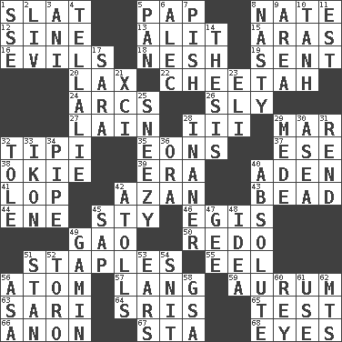 ACROSS 1. Narrow board 5. Infant food 8. Nathan's nickname 12. Trig term 13. Set down 15. Ancient river in northeast Turkey 16. Vices 18. Tender 19. Transmitted 20. Not strict 22. Leopard's kin 24. Arches 26. Roguish 27. (Had) reclined 28. One more than two 29. Third mo. 32. Native american tent (variation) 35. Immeasurably long periods of time 37. Compass dir. 38. Migrant worker of the '30s 39. Epoch 40. Arabian gulf 41. Trim (branches) 42. Muslim summons to prayer 43. Necklace unit 44. Compass dir. 45. Filthy place 46. The front part of a cuirass 49. E Mali city 50. Redecorate 51. Paper fasteners 55. Snakelike fish 56. Smallest unit of an element 57. Austrian-born American filmmaker Fritz 59. Gold (Symbol: Au) 63. Indian skirt 64. Indian titles of respect 65. Trial 66. Soon (poet.) 67. R.R. building 68. Snake ____ (dice throw) DOWN 1. Compass dir. 2. 54 in ancient Rome 3. Cuckoo 4. Copy Pinocchio 5. Baking dish 6. Actor Baldwin 7. Expression of disdain 8. Offensive 9. Type of rug 10. Hyperbolic tangent 11. Eastern Standard Time (abbr.) 14. College paper 17. "Two Mules for Sister ____" 21. One more than ninety 23. Biblical high priest 25. Dwarf with a sinus problem 28. More lacking in sense or substance 29. Ancient Persian 30. Toward the sea 31. Tear apart 32. Lacquered or enameled metalware 33. Image 34. Corncob 36. Mouth or opening 40. Utter; complete 42. Ringlike coral islands and reefs 45. Plant excrement 47. Turn to the right 48. It may be bright or harebrained 49. Street urchin 51. Comedian Laurel of Laurel & Hardy 52. "Corrida" creature 53. Hearing organs 54. In a ____ (agitated or irritated) 56. White ___ sheet 58. Girls' org. (abbr.) 60. Marina Del _, California 61. Purpose 62. Mountains (abbr.)
