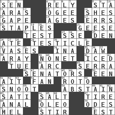 ACROSS 1. Elected rep. 4. Have trust in 8. R.R. building 11. Ancient river in northeast Turkey 13. Double curve, resembling the letter S 14. "______ My Girl" (Turtles hit) 15. Yawn 16. Eons 17. Blunders 18. Paper fasteners 21. Honkers 22. Trial 23. Compass dir. 25. Lair 26. Had dinner 29. A testis 32. Flower holders 34. _ tizzy (2 wds.) 35. Simpleton 38. Like ___ of sunshine 39. Music written for nine 41. On the rocks 43. Third day of the wk. 44. Curve 45. Father Junipero _ 46. Elected representatives 50. Car or cant ending 51. Small island 54. Avid follower 55. Printing process, for short 57. Snob 59. Refrain by choice 63. Suttee (variant) 64. Table seasoning 67. Become fatigued 68. Of or related to the anus 69. Butter sub 70. Lyric poems 71. Cartoonist voice _ Blanc 72. Disorderly outburst 73. Eastern Standard Time (abbr.) DOWN 1. Sinks 2. Part of Q.E.F. 3. California wine valley 4. Exposes to great heat 5. Ovum 6. Area sheltered from the wind 7. Affirmative reply 8. Fragment 9. Laconic 10. NE Netherlands city 12. Back-to-school mo. 14. Perceive with the eye 19. Allows 20. Compass dir. 21. Set 23. Trig term 24. Go away! 26. Actress Gardner 27. Small pie 28. Son of Isaac 30. Colored lightly or faintly 31. Singer Brickell 33. Sight organs 36. 1/640 square mile 37. We are 39. Nanny 40. NW Algerian seaport 42. Daniel's nick name 45. Fast planes 47. Bank Draft (abbr.) 48. Speaker 49. Director Reiner 51. Indian state 52. Lacking in sense or substance 53. Add up to 56. "Beetle Bailey" pooch 58. Lubricate 60. Helper 61. Angers 62. A home for chicks 64. Mayday 65. The first octave above the treble staff 66. Luau accessory
