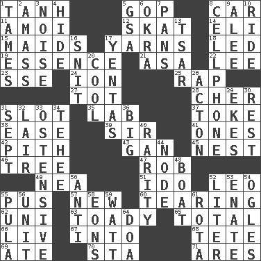 ACROSS 1. Hyperbolic tangent 5. Republican Party 8. Auto 11. Mine, in Marseilles 12. Three-handed card game 14. Connecticut Ivy Leaguer 15. Unmarried girls 17. Entertaining tales 18. Directed 19. Substance 21. White ___ sheet 22. Area sheltered from the wind 23. Compass dir. 24. Electrically charged atom 25. Reproach for some lapse or misdeed 27. Small child 28. "Mermaids" star 31. Position in a hierarchy or organization 35. Experiment locale 37. Puff or smoke 38. Relaxation 39. Title for a knight 41. Singles 42. Heart or essence 43. Separate the seeds from cotton 45. A home for chicks 46. Family _ (genealogy) 47. Director Reiner 49. Teachers' org. 51. Wedding promise 52. Lion 55. Tenth month of the Hindu calendar 57. ___ Haven, CT 60. Lacerating 62. Single; one (prefix) 63. Sycophant 65. "_____ Recall" 66. 54 in ancient Rome 67. To the inside or interior of 68. False hair 69. Had dinner 70. R.R. building 71. Ancient Greek god of war DOWN 1. Makes less strong or intense 2. Collect or gather 3. Annoying sound 4. Flintstone garb 5. Girls' org. (abbr.) 6. Gumbo ingredient 7. Zero-star reviews 8. Portable communications device 9. Toward shelter 10. Travel on or in a vehicle 13. Russian ruler of old 16. In a ____ (agitated or irritated) 17. Gossips 20. Calm and collected 26. NE Massachussets city 29. Makes supply last 30. Respite 31. Back-to-school mo. 32. Den 33. Clearly or manifestly demonstrative 34. Giggle 36. Massive 40. Noteworthy scarcity 44. Connecting point 48. Water vessel 50. Opposed to 52. 61 cubic inches 53. Related on the mother's side 54. Stares at amorously 55. Monetary unit of Botswana 56. A single undivided whole 58. Immeasurably long periods of time 59. Electrical Unit 61. Roll call or roster of names 64. ___ good deed