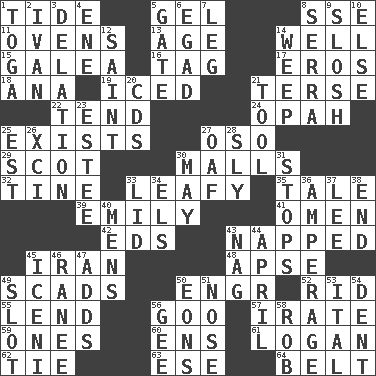 ACROSS 1. Periodic rise and fall of the sea level 5. Set 8. Compass dir. 11. Baking chambers 13. Personal question 14. Not ill 15. An organ shaped like a helmet 16. Label 17. Greek god of love 18. Santa ___, CA 19. On the rocks 21. Laconic 22. Watch over 24. Brightly colored fish 25. Is extant 27. Bear (Spanish) 29. Highlander 30. Shopping centers 32. Prong on a fork 33. Like summer trees 35. Lie 39. Poet Dickinson 41. Presage 42. Begley and Asner 43. Slept 45. SW Asia republic 48. Domed church section 49. Tons 50. Engineer (abbr.) 52. To free from 55. Grant temporary use of 56. Thick or sticky substance 57. Feeling or showing extreme anger 59. Singles 60. Followers of ems 61. Utah city north of Ogden 62. Standoff 63. Compass dir. 64. Waist strap DOWN 1. Ancient Roman robe 2. "Terrible" tsar 3. Accusation by an informer 4. Compass dir. 5. Yard entry 6. Mild oath 7. Part of a journey 8. Father Junipero _ 9. Make a splashing sound 10. Otherwise 12. Virtuous person 14. Shed a tear 20. Music discs 21. Instrument 23. First name in cosmetics 25. Eastern Standard Time (abbr.) 26. One more than ninety 27. Clumsy lout 28. Stealthy 30. Can I? 31. Ceases 33. Hat (slang) 34. Raised railways 36. Electrical Measurement 37. Area sheltered from the wind 38. Conclusion 40. Not women's 43. Tired old horse 44. Showery time 45. Ancient Celtic tribe of eastern Britain 46. The wife of a rajah (variant) 47. Sums up 49. Notch 50. Immeasurably long periods of time 51. Sense of smell 53. Slanted text style (abbr.) 54. Scratch 56. Turn to the right 58. Director Reiner