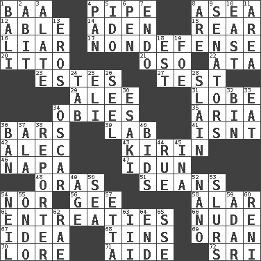 ACROSS 1. Sound made by sheep 4. Corncob 8. At sea 12. Competent 14. An important port of Yemen 15. Rump 16. One who doesn't tell the truth 17. Unrelated to defense, as in spending 20. "Tell ____ the Marines!" 21. Bear (Spanish) 22. _ moment's notice (2 wds.) 23. _____ Park, CO 27. Trial 29. Toward shelter 31. Ear part 34. Off-Broadway awards 35. Roberta Peters solo 36. Long, evenly shaped pieces 39. Experiment locale 41. Is not 42. Actor Baldwin 43. Japanese brewing company 46. California wine valley 47. Goddess of spring and wife of Bragi 48. Mouths or openings 51. Seines 54. And not 56. Turn to the right 58. Having or resembling wings 61. Pleas 66. Naked 67. The content of cognition 68. Canisters 69. NW Algerian seaport 70. Old wives' tales, e.g. 71. Assistant 72. _ Lanka DOWN 1. Indonesian resort city 2. "This won't hurt ____!" 3. Having winglike extensions 4. Baking dish 5. Wedding promise 6. Writing instrument 7. Inside; within (prefix) 8. "We ___ not amused" (Victoria) 9. Legislators 10. 90 degrees 11. Type of rug 13. Greek god of love 18. Eastern Standard Time (abbr.) 19. Enemy 24. Keyboard key 25. Connecticut Ivy Leaguer 26. Sew up the eyelids of hawks and falcons 28. Killed 30. 1973 Nobel Price Winner (Physics) Leo 32. Storage container 33. Erode 34. Witty Wilde 36. Forbid 37. Wing 38. Newsperson 40. Auction offers 44. Regret 45. _ tizzy (2 wds.) 49. Mature 50. Ocean 52. Billionth: prefix 53. Plays smoothly or legato 54. Famous astronaut Armstrong 55. Southwest Nigerian state 57. Singer James 59. The sixth month of the Jewish calendar 60. Painter Guido (1575-1642) 62. Actress Charlotte 63. One more than two 64. Conclude 65. Compass dir.