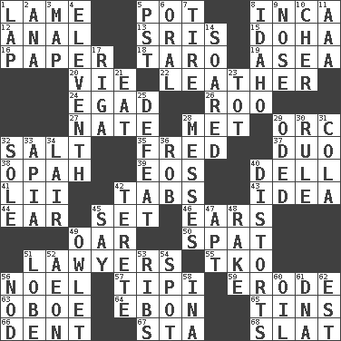 ACROSS 1. Unable to walk 5. Plant holder 8. South American Indian 12. Of or related to the anus 13. Indian titles of respect 15. Capital of the state of Qatar 16. Some stationery 18. Pacific island yam 19. Toward the sea 20. Compete 22. Cordwainer's material 24. Mild oath 26. Friend of Pooh 27. Nathan's nickname 28. Was introduced to 29. The grampus (Milton) 32. Table seasoning 35. Flintstone 37. Superhero pair 38. Brightly colored fish 39. Greek goddess of the dawn 40. Small valley 41. Cards in a Roman deck? 42. Bar bills 43. It may be bright or harebrained 44. Hearing organ 45. Arrange properly for use 46. Hearing organs 49. Rowing implement 50. Petty quarrel 51. Those who practice law 55. Ring climax 56. Christmas carol 57. Native american tent (variation) 59. Eat (away) 63. Mitch Miller's instrument 64. Inky black, to poets 65. Metal containers 66. Gouge 67. R.R. building 68. Narrow board DOWN 1. Infant locale 2. Santa ___, CA 3. Atlas unit 4. Veterans Day date 5. Pacific Standard Time (abbr.) 6. Relating to the mouth 7. Hoop that covers a wheel 8. Potato state 9. Characteristic smell of wine 10. "Mermaids" star 11. Auto club (abbr.) 14. Flew 17. Capital of Latvia 21. Erode 23. Small child 25. Outscore 28. Makes clutter 29. Wrote a lyric poem 30. Governing power 31. Root beer relative 32. Flatfish 33. Capital of Western Samoa 34. Den 36. Director Reiner 40. What propaganda does 42. Cylindrical with tapered ends 45. Declare 47. Fitting 48. Immoral or dissolute person 49. A small or young owl 51. Ear part 52. A really long time 53. Teases 54. Specific locale 56. Lower and raise head in agreement 58. _ tizzy (2 wds.) 60. Petroleum 61. Heredity factor (abbr.) 62. Eastern Standard Time (abbr.)