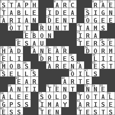 ACROSS 1. Staphylococcus 6. Curve 9. Actress Charlotte 12. Eating place 13. It may be bright or harebrained 14. Omen 15. Believer in; advocate of (suffix) 16. Gouge 17. Double curve, resembling the letter S 18. Baseball player Mel 19. Undersized animal 20. Scottish caps 21. Inky black, to poets 23. Lyricist Gershwin 24. He sold his birthright 25. Laconic 28. Possessed 30. Approach 34. Dormintory (informal) 35. Biblical high priest 36. Frees from moisture 38. Cards in a Roman deck? 39. Crowds into 41. Sports stadium 43. Eastern Standard Time (abbr.) 44. Makes a sale 46. Lubricates 48. Ewer handle 49. Johnson of "Laugh-In" 50. Opposed to 51. Portable shelter 53. Compass dir. 56. Toward shelter 57. Exchanged or delivered for money 58. Add up to 60. Global Positioning Systems (abbr.) 61. "If ____ say so..." 62. Get up 63. Curvy letter 64. "___ Little Indians" 65. Trials DOWN 1. R.R. building 2. Pacific island yam 3. "This won't hurt ____!" 4. Food holders 5. Layer 6. An important port of Yemen 7. Monthly bill 8. Domesticated feline 9. Frustrating wastes of time 10. Eons 11. Compass dir. 13. Goddess of spring and wife of Bragi 14. Flew 19. One shot 20. Teat (slang) 22. Sound made by sheep 24. The property of being fit to eat 26. Indian titles of respect 27. Send forth 28. Is hesitant and indecisive 29. _ vera 31. Period 32. Wind 33. To sift 37. Derisive sound 40. Chalkboards 42. Small island 45. Indian title of respect (Mr.) 47. Poe poem 49. "60 Minutes" Commentator Rooney 50. High mountains 51. Heavy book 52. Enthusiasm 54. Nuclear Threat Initiatives 55. Compass direction 56. Grow older 57. Be seated 58. Make lace 59. French article