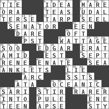 ACROSS 1. Standoff 4. The content of cognition 8. Female horse 12. Mouth or opening 13. Afternoon social gatherings 14. Hereditary estate 15. Laconic 18. Canvas cover 19. Sew up the eyelids of hawks and falcons 20. Legislator 22. Car or cant ending 23. Have the gumption 24. Often (poetically) 25. Pacific Standard Time (abbr.) 26. Electrical Measurement 30. "Barney Miller" actor Jack 33. _ Allan Poe 36. Part of Q.E.F. 37. Among 39. Eastern Standard Time (abbr.) 40. Back-to-school mo. 41. French philosopher Descartes 42. Related on the mother's side 44. Ocean 45. Short socks 47. Falsehood 50. Curve 51. Fast planes 53. "One Day ___ Time" 54. Pertaining to the sea 57. Indian skirt 59. Tumult 61. Less widely known 63. To the inside or interior of 64. Whimper 65. Compass dir. 66. Adolescent 67. Domed church section 68. Filthy place DOWN 1. Small child 2. Angers 3. Having ears or earlike features 4. "Tell ____ the Marines!" 5. Letter starter 6. Ewer handle 7. Viper 8. French bagpipes 9. An important port of Yemen 10. Actress Charlotte 11. Pipe bend 16. Fastener 17. Hearing organs 21. Wig 22. Newt 24. Rowing implement 26. Electrical Unit 27. Ancient Greek god of war 28. Yawn 29. Singer James 30. "Two Mules for Sister ____" 31. Sign of something about to happen 32. Pig sound 34. Hiding places for outlaws 35. Girls' org. (abbr.) 38. Accusation by an informer 42. And so on (abbr.) 43. Otherwise 46. Epoch 48. Austrian river, tributary to the Danube 49. Inactive volcano in Sicily 52. Fathers 53. Johnson of "Laugh-In" 54. Lubricates 55. Algonquian 56. Penny 57. Be seated 58. One (Scot) 59. Health resort 60. Uncastrated adult male sheep 62. Marina Del _, California