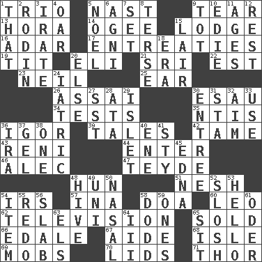 ACROSS 1. Musical group of three 5. Political cartoonist Thomas 9. Pull into pieces 13. Israeli folk dance 14. Double curve, resembling the letter S 15. Inn 16. The sixth month of the Jewish calendar 17. Pleas 19. Teat (slang) 20. Biblical high priest 21. _ Lanka 22. Eastern Standard Time (abbr.) 23. Famous astronaut Armstrong 25. Ewer handle 26. Slender Brazilian palm 30. He sold his birthright 34. Trials 35. Nuclear Threat Initiatives 36. Russian composer Stravinsky 39. Lies 42. Docile 43. Painter Guido (1575-1642) 44. Keyboard key 46. Actor Baldwin 47. Miss Universe 1986, Barbara Palacios _ 48. Attila the _ 51. Tender 54. Big collection agency 57. _ tizzy (2 wds.) 58. ___ good deed 60. Lion 62. Boob tube 65. Disposed of to a purchaser 66. Peak District village in England 67. Helper 68. Capri or Wight 69. Disorderly crowds 70. Hats (slang) 71. Son of Odin DOWN 1. Not this but _ 2. "The Thinker" sculptor 3. Feeling or showing extreme anger 4. Rowing implement 5. Christmas carol 6. Hindu god of fire 7. Put into a specified state 8. Laconic 9. Small child 10. Singer Brickell 11. Grows older 12. Relief 15. Den 18. Period 20. Otherwise 24. Of or pertaining to medicine 27. Fast jet (abbr.) 28. "One Day ___ Time" 29. Small island 30. Main course 31. R.R. building 32. Direct toward a target or goal 33. Purpose 36. Lyricist Gershwin 37. Set 38. Single 40. Compass dir. 41. Filthy place 45. Pulitzer Prize-winning author Ferber 48. Hub of activity 49. Corn or form start 50. Relating to the nose 52. Make a splashing sound 53. Phone greeting 54. A whole individual unit 55. Do over again 56. Broad, flat, thick piece 58. Texas town _ City 59. Washington bills 61. River in Europe 63. Raised railways 64. One more than two 65. Be seated