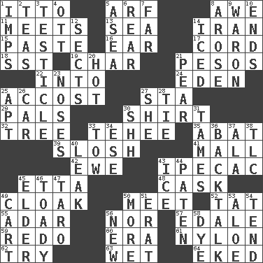 ACROSS 1. "Tell ____ the Marines!" 5. Sandy's bark 8. Deep reverence 11. Confronts 13. Ocean 14. SW Asia republic 15. Thick mixture 16. Ewer handle 17. Drawstring 18. Fast jet (abbr.) 19. Burn to charcoal 21. Mexican monetary units 22. To the inside or interior of 24. Locale of original sin 25. Buttonhole 27. R.R. building 29. Friends 30. Chest covering 32. Relationship diagram 33. Giggle 35. Blind as ____ 39. Agitate, as a liquid 41. Shopping center 42. She-sheep 43. Medicinal drug used to evoke vomiting 45. Singer James 48. Keg 49. Anything that covers or conceals 50. Rendezvous 52. Make lace 55. The sixth month of the Jewish calendar 56. Or not 57. Peak District village in England 59. Redecorate 60. Epoch 61. Thermoplastic polyamide 62. Attempt to accomplish something 63. Soggy 64. Made supply last DOWN 1. Naughty children 2. Afternoon social gatherings 3. A testis 4. Baseball player Mel 5. At sea 6. Buttocks 7. Distant 8. Came up 9. Make _____ (do battle with) 10. Extremities 12. Religious groups 14. On the rocks 20. Being at a high temperature 21. Lightbulb-shaped fruit 23. Olfactory organs 25. Fitting 26. Automobile 27. A female animal or person 28. Neckwear 30. Quiet! 31. Domesticates 33. Pull behind 34. Compass dir. 36. Sass 37. Insect wing 38. Affectionate concern, for short 40. Path through which fluid escapes 43. Frozen water 44. Eucharist need 45. A person who is older than you are 46. Sycophant 47. Pacific island yam 49. Draw slowly or heavily 50. Greater amount 51. Part of Q.E.F. 53. Medicinal plant 54. Watch over 56. ___ Haven, CT 58. Color