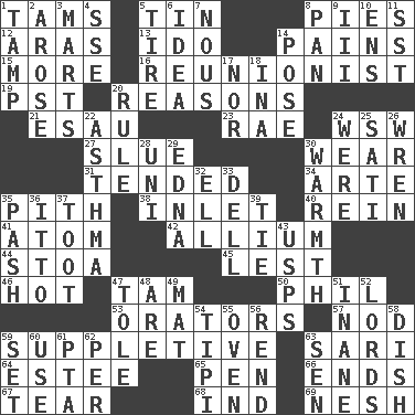 ACROSS 1. Scottish caps 5. Shallow baking pan 8. Sliced desserts 12. Ancient river in northeast Turkey 13. Wedding promise 14. Aches 15. Greater amount 16. One who advocates reunion 19. Pacific Standard Time (abbr.) 20. Thinks logically 21. Son of Isaac 23. Actress Charlotte 24. Compass dir. 27. Change direction abruptly 30. Put on (as clothing) 31. Watched over 34. Johnson of "Laugh-In" 35. Heart or essence 38. An arm off of a larger body of water 40. It's straight from the horse's mouth 41. Smallest unit of an element 42. Plant genus of onion and garlic 44. Portico 45. For fear that 46. Being at a high temperature 47. Scottish cap 50. Silvers or Donahue 53. Speakers 57. Dreamland 59. Supplying deficiencies 63. Indian skirt 64. First name in cosmetics 65. Writing instrument 66. Extremities 67. Pull into pieces 68. Indiana (abbr.) 69. Tender DOWN 1. Pack (down) 2. Came up 3. Shops 4. Compass dir. 5. Hoop that covers a wheel 6. The main thing one is thinking about 7. Good sense 8. Baking dish 9. One more than two 10. Followers of ems 11. Fast jet (abbr.) 14. Airs 17. And not 18. _ tizzy (2 wds.) 20. Court order 22. Respiratory problem 24. Past tense of be (plural) 25. Suttee (variant) 26. Songbird 28. Corn or form start 29. Pulitzer Prize-winning author Ferber 30. Heat 32. Pipe bend 33. Small valley 35. Romantic infatuation 36. "Tell ____ the Marines!" 37. A blast of a horn 39. Standoff 43. United States Postal Service (abbr.) 47. Lacquered or enameled metalware 48. "We ___ not amused" (Victoria) 49. Floor covering 51. Lacking in sense or substance 52. Domineers 54. Native american tent (variation) 55. Baking chamber 56. Tear apart 58. Food container 59. Put into a specified state 60. Purpose 61. Parent Teacher Association (abbr.) 62. For each 63. Elected rep.
